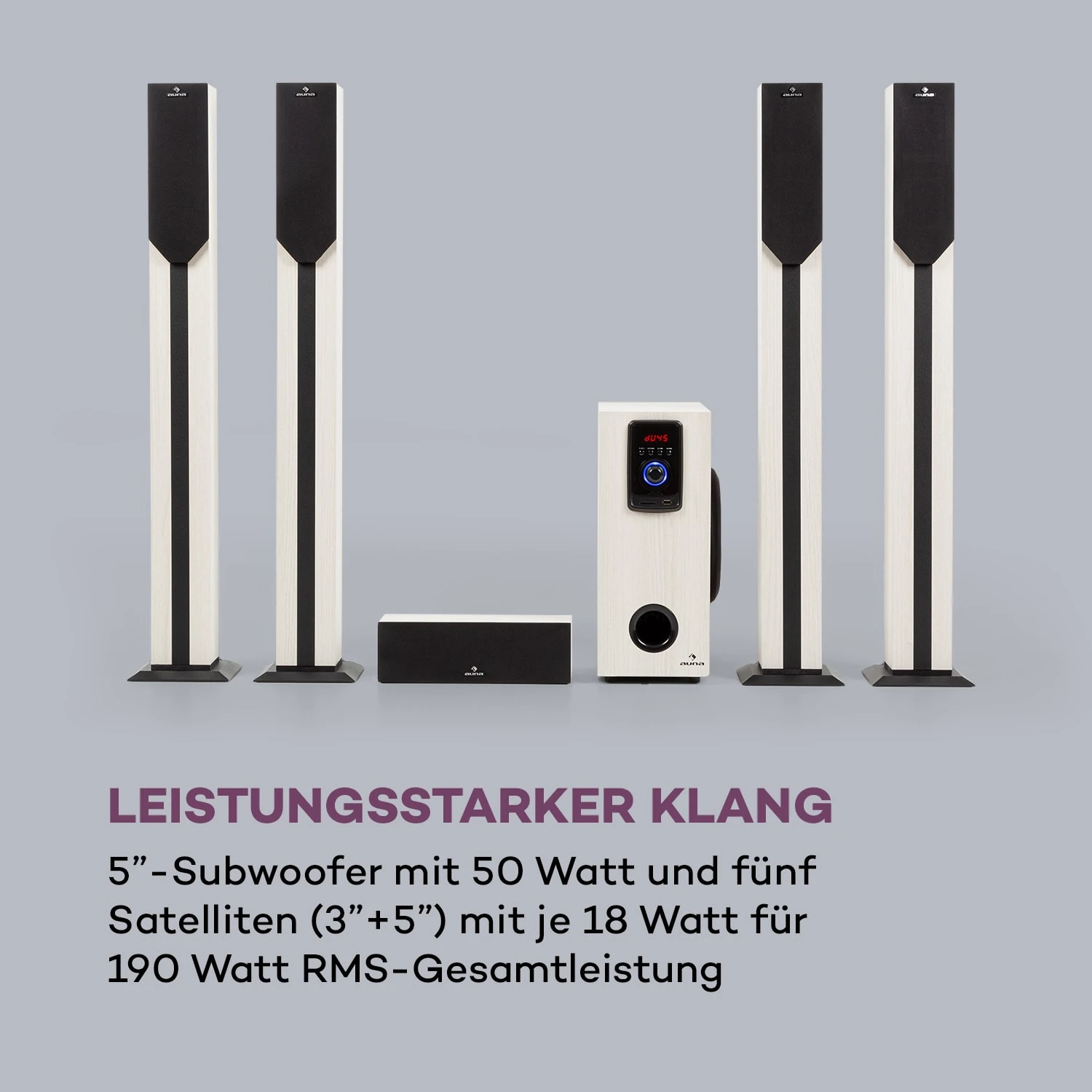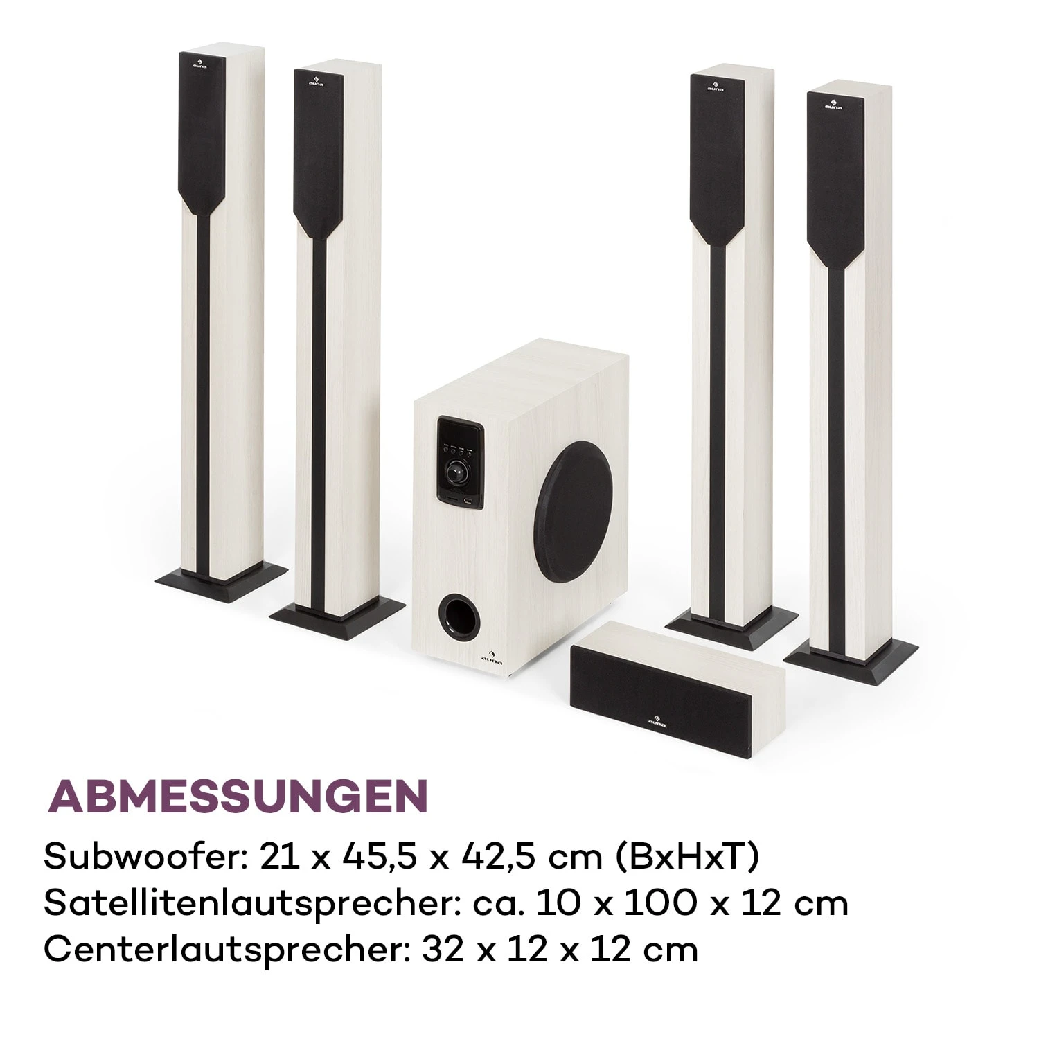 Technischer Mittelpunkt des Heimkinosystems ist der aktive Subwoofer, der die fünf Satellitenlautsprecher dirigiert und antreibt. Der 5″ Bassreflex-Subwoofer erzeugt im Zusammenspiel mit den Lautsprechern, bestehend aus vier Stands und einem Center, einen runden, raumfüllenden Gesamtklang mit 190 Watt RMS Gesamtleistung. Äußerst verbindungsfreudig bezieht die auna Elegance 5.1-Anlage dabei ihren Sound aus den verschiedensten Quellen: Durch die frontseitig verbauten USB- und SD-Ports kommuniziert die Surround-Anlage mit portablen Datenträgern wie USB-Sticks und SD-Karten für den unkomplizierten Zugriff auf MP3-Titel. Die Bluetooth-Schnittstelle ermöglicht zudem drahtloses Streaming via Smartphone, Tablet oder Laptop. Über den rückseitigen AUX-Eingang können zusätzlich Audiokomponenten aller Art, wie Computer, CD- & MP3-Player, mit dem auna Areal Elegance verbunden werden. Auch zwei kabelgebundene Mikrofone finden mit zwei 6,3 mm großen Eingängen an der Rückseite des Subwoofers ihren Anschlussort. Die Lautsprecherverkettung der Satteliten erfolgt per Lautsprecherklemmen und geht kinderleicht von der Hand, während sich Menüs und Klangeinstellung über die mitgelieferte Fernbedienung anpassen lassen. Auch optisch überzeugt das auna Areal Elegance Surround-System auf ganzer Linie und fügt sich dank elegantem Gesamtdesign in heller Holzoptik ideal in jedes Wohnzimmerambiente ein.