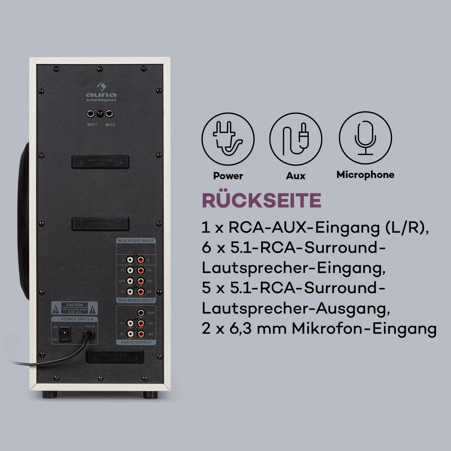 - Anschlüsse-Subwoofer: 1 x USB-Port, 1 x SD-Speicherkarten-Slot, 1 x RCA-AUX-Eingang (L/R), 6 x 5.1-RCA-Surround-Lautsprecher-Eingang, 5 x 5.1-RCA-Surround-Lautsprecher-Ausgang, 2 x 6,3mm-Mikrofon-Eingang