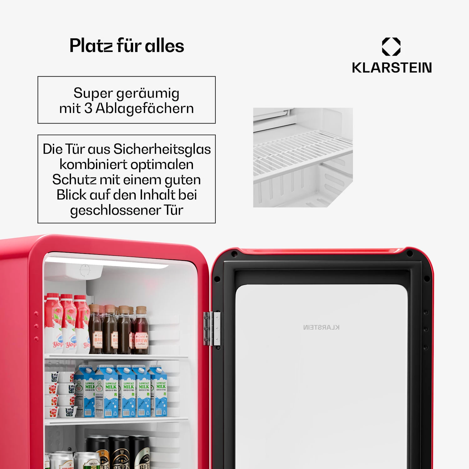 Dank seiner energieeffizienten Klasse C schont der Klarstein Audrey Evo Getränkekühlschrank nicht nur Ihren Geldbeutel sondern auch die Umwelt. Die doppelt verglaste Tür ermöglicht Ihnen einen schnellen Überblick über den Inhalt und schützt gleichzeitig vor Sonneneinstrahlung sodass die Temperatur konstant bleibt. Der Getränkekühlschrank mit Glastür bietet eine stilvolle Retro-Optik mit ihren lebendigen Farben und geschwungenen Formen die dem Kühlschrank einen zeitlosen Charme verleihen und ihn zu einem dekorativen Highlight in Ihrer Wohnung machen.