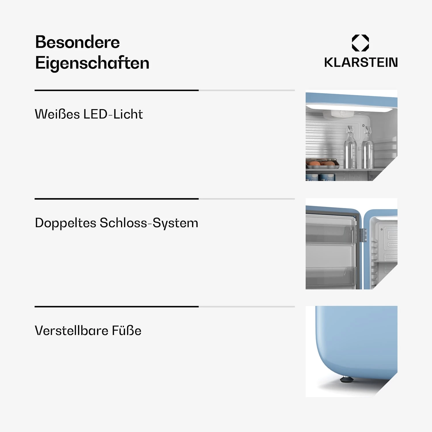 Der Klarstein Audrey Evo Mini Kühlschrank kombiniert charmantes Retro-Design mit moderner Technik. Mit einer Kapazität von 90 Litern, geringer Lautstärke und flexiblen Aufstellmöglichkeiten ist er die perfekte Ergänzung für stilvolle Wohn- und Arbeitsbereiche.