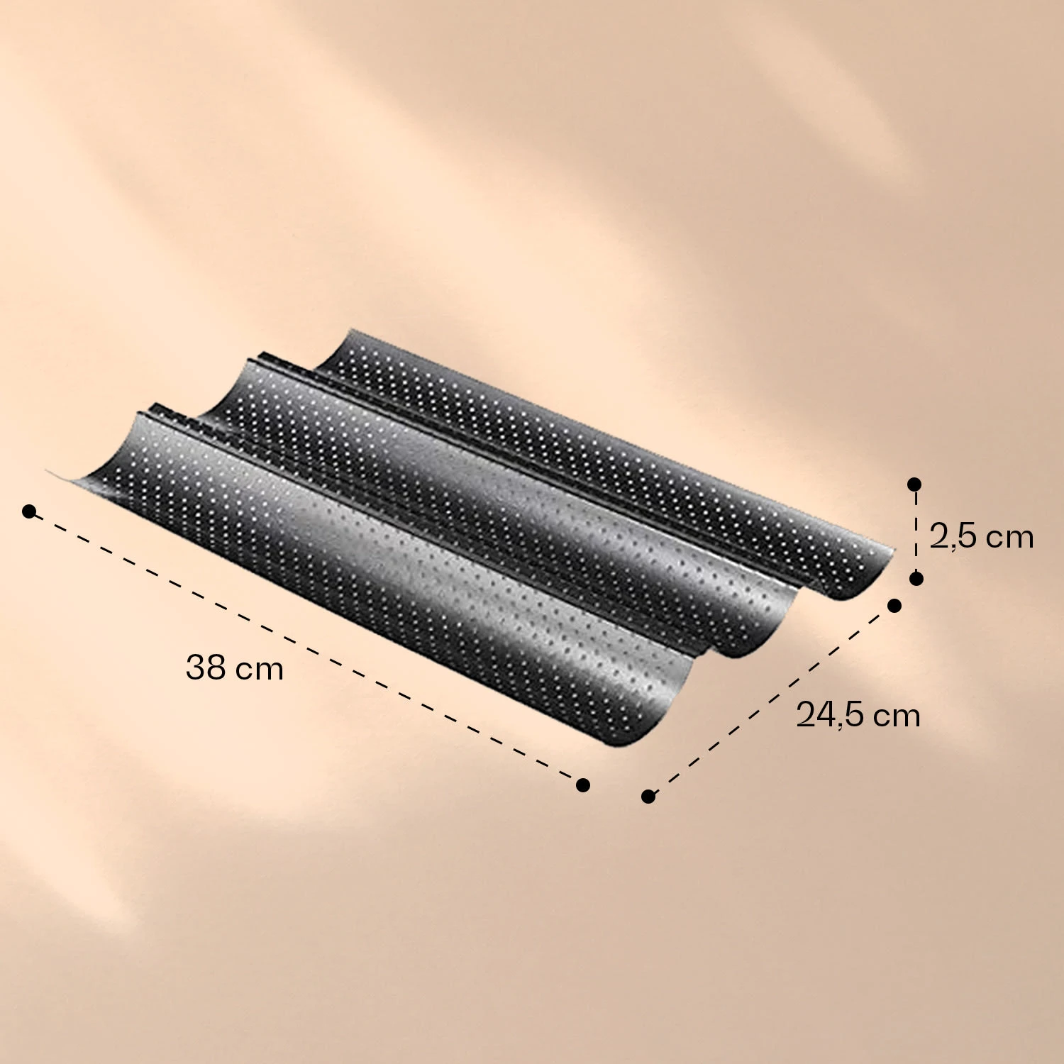 Feinster Brotgenuss der französischen Art: Mit dem raffinierten Baguetteblech von Feelino by Klarstein kannst du ab sofort köstliche Weißbrotstangen ganz frisch selber backen. Das Backblech ist aus mehreren Mulden geformt, in welchen sich der Brotteig beim Backvorgang zur originalen Baguetteform wölbt. Hergestellt aus hochwertigem Carbonstahl bietet dir die Baguetteform viele Vorteile: sie verfügt über eine gute Antihaftbeschichtung, ist lebensmittelecht und lässt sich leicht reinigen. Zudem ist das Brotblech mit einer speziellen Lochung ausgestattet, welche für eine optimale Wärmeverteilung und dadurch für sehr gleichmäßige Backergebnisse sorgt. Auch bekommt dein frisches Baguette dadurch eine gleichmäßig braune, knusprige Kruste. Dank den vorgeformten Mulden des Baguetteblechs kannst du hier gleich mehrere knusprig frische Baguettes auf einmal zaubern.