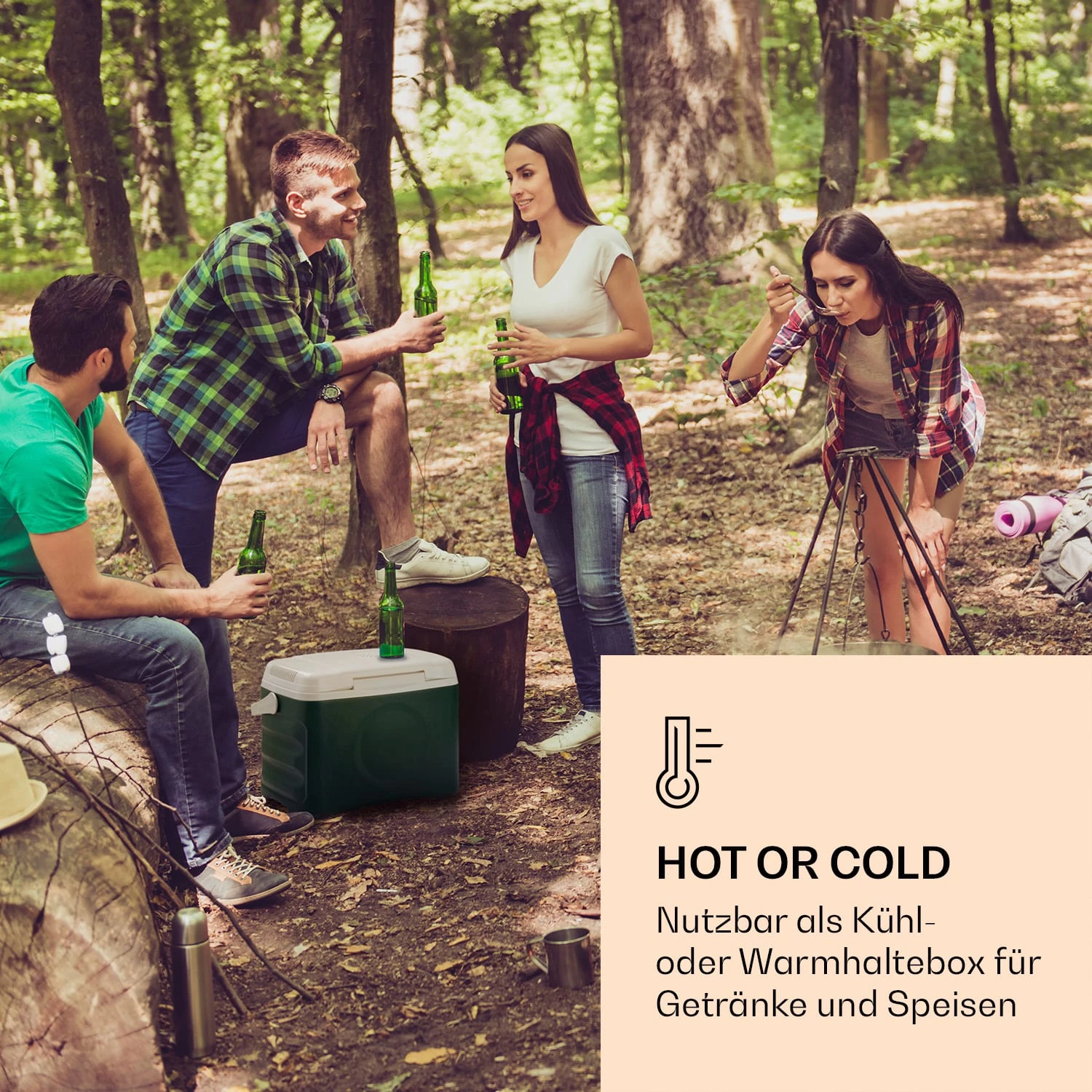Hot or cold? Du hast die Wahl mit der praktischen Klarstein BeerBelly 21 Kühl- und Warmhaltebox. Die 44 x 35 x 28 cm (BxHxT) große Truhe ist dein idealer Begleiter bei langen Autofahrten, Festivals oder Picknicks. Flexibel nutzbar via Netzkabel, Zigarettenanzünder oder USB. Gehäuse und Deckel sind aus hochwertigem, lebensmittelechtem Kunststoff gefertigt. Der große Tragegriff dient gleichzeitig als sicherer Verschluss.