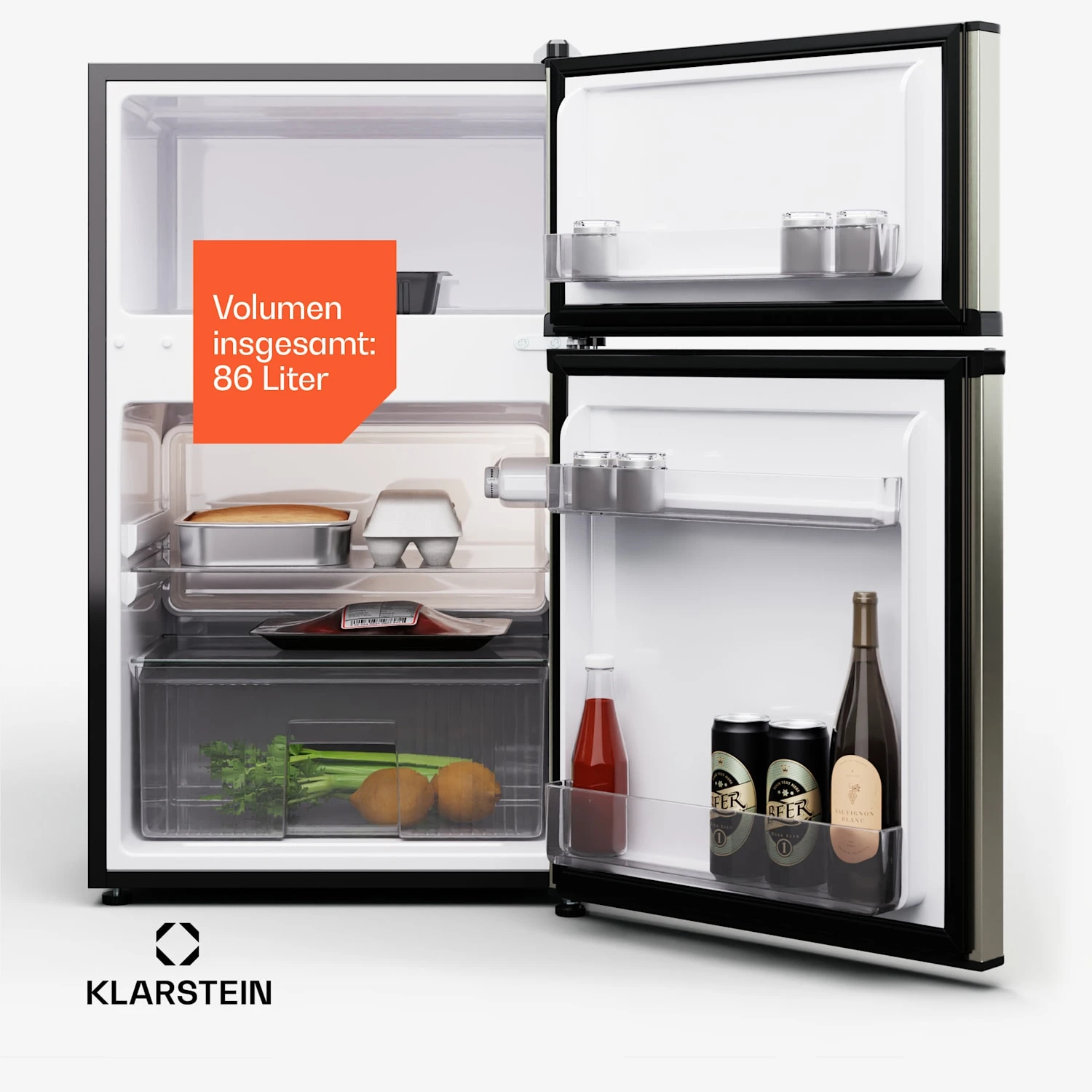 Stay cool! Die Klarstein Big Daddy Cool Kühl-Gefrierkombination mit einem Gesamtfassungsvermögen von 86 Litern bringt Ordnung und Übersicht in die Frischhaltung der Lebensmittel von Kleinhaushalten. Mit zwei herausnehmbaren Glas-Einschüben, dem separaten Gefrierfach und einem extra kühlen Crisper-Fach für Obst und Gemüse ist reichlich Platz für die optimal gekühlte Aufbewahrung – dabei nimmt der verbrauchsarme Kühlschrank in deiner Küche nicht viel Raum ein.