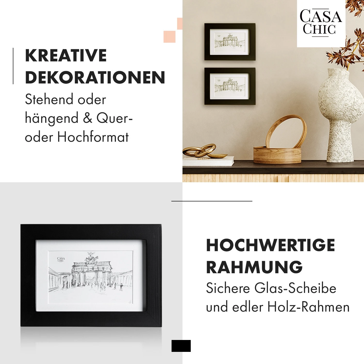 Der exklusive Bilderrahmen Brighton von Casa Chic by blumfeldt gibt jedem Bild den perfekten Rahmen. Hier verbindet sich hochwertige Qualität aus Handarbeit mit besonders stilvollem Design. Hinter echtem Glas finden Kunstobjekte, Drucke oder Fotografien optimalen Schutz vor Staub, Feuchtigkeit und Licht. Die Tiefe des Brighton Bilderrahmens hebt dabei deine Bilder in jedem Raum wundervoll hervor und das breite Rahmenprofil wird zum eleganten Kontrast. Den hochwertigen Fotorahmen kannst du sowohl im Quer- als auch im Hochformat nutzen und er ist an der Rückseite mit einem Aufsteller und einer Aufhängung versehen. Ohne Passepartout ist er passend für das Bildformat 10 x 15 cm. Hinter dem dazugehörigen Passepartout kannst du Fotos und Bilder mit einem Format von 7 x 11 cm kunstvoll präsentieren.