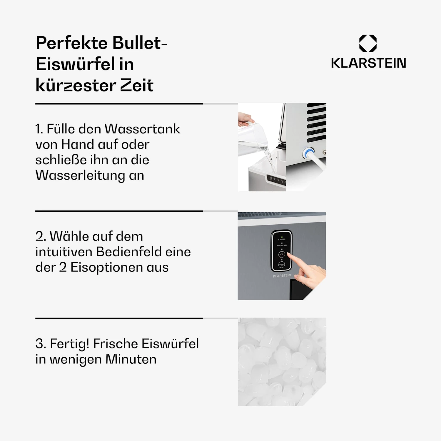 - Eisproduktion pro Zyklus: 12 Eiswürfel in 12 Minuten