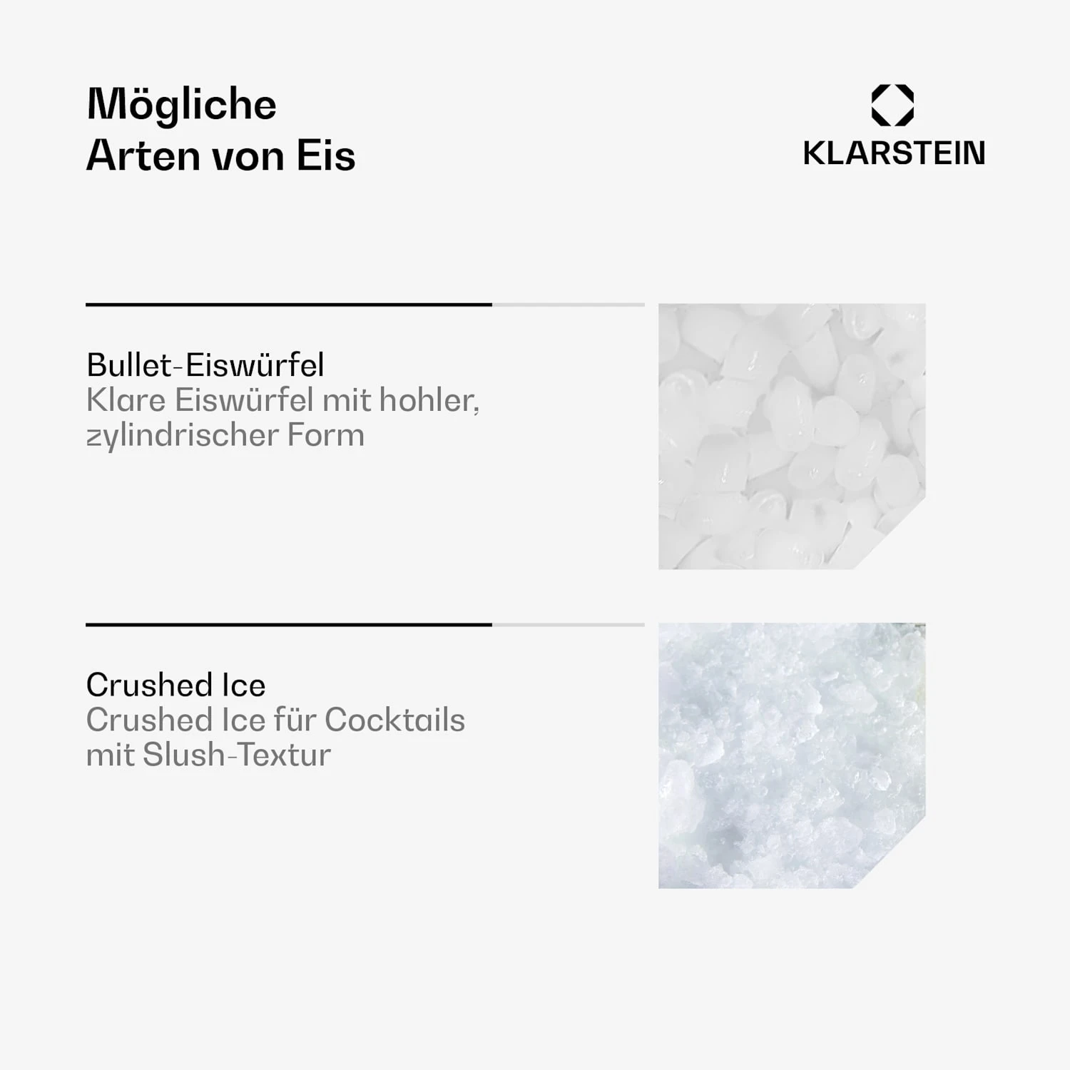 - Zwei Eisarten: Bullet Ice und Shaved Ice