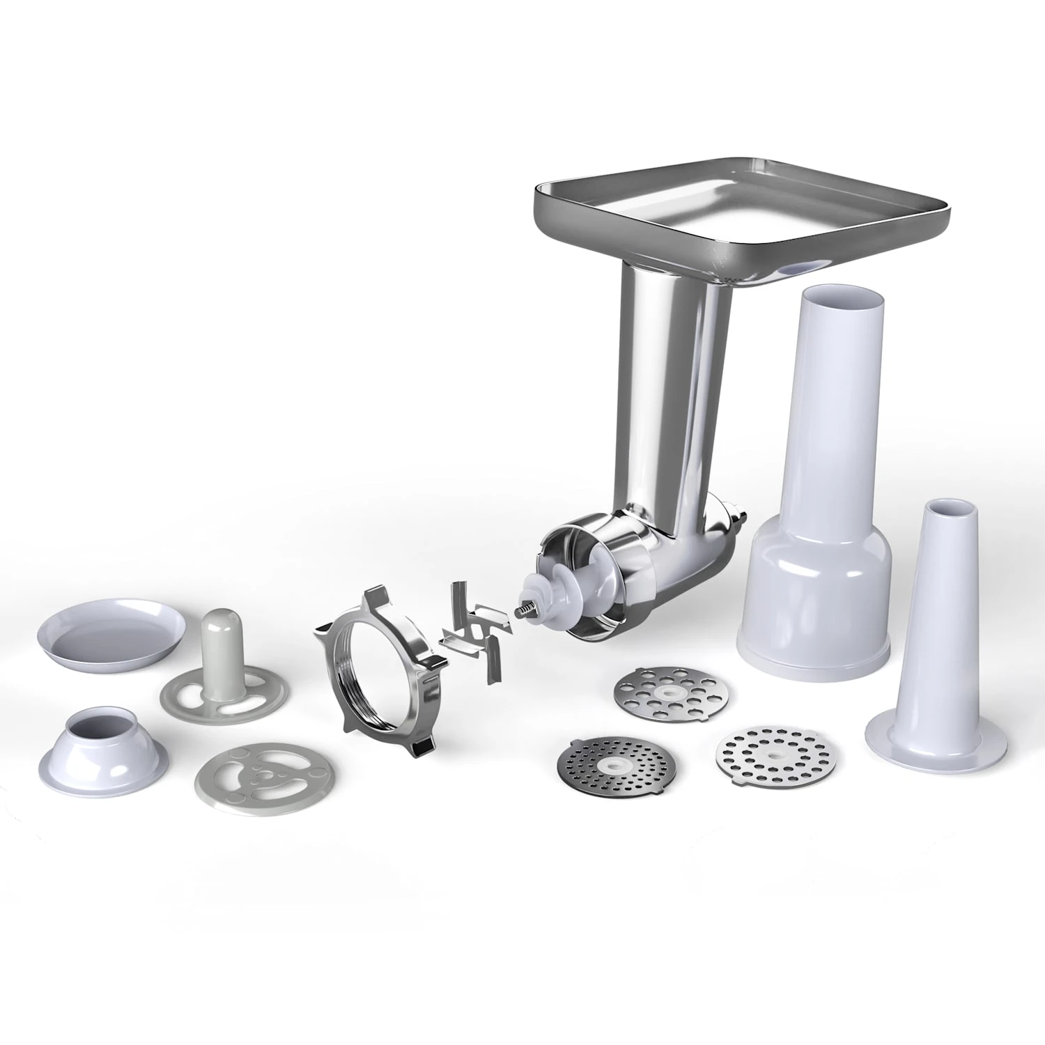 Vielseitig und robust: Hochwertiges Fleischwolf-Zubehör in metallischem Design, ideal für Fleisch, Fisch, Nüsse und Gemüse.