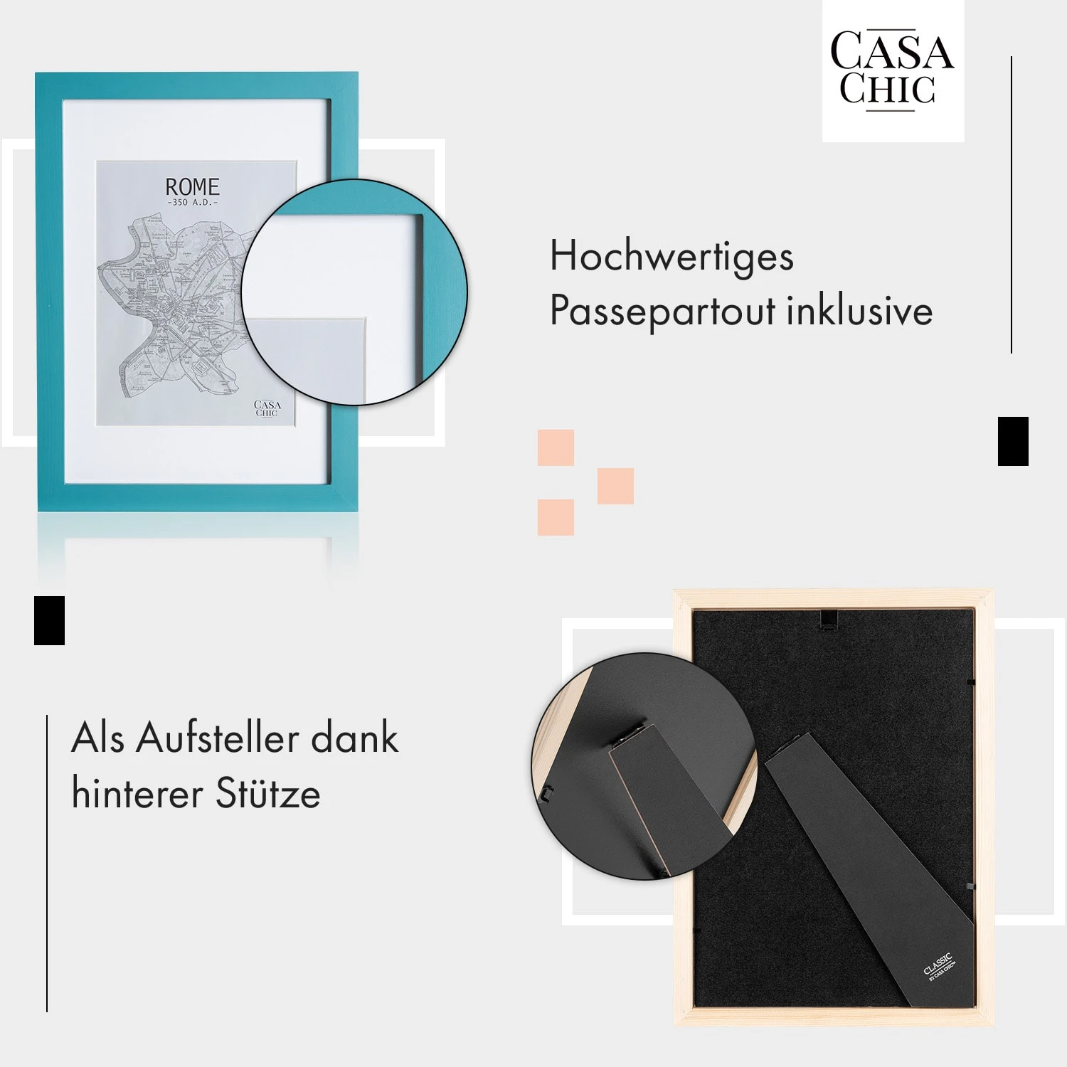 Die Casa Chic by blumfeldt Clapton Bilderrahmen bringen eine neue Eleganz in dein Zuhause. Setze deine Lieblingsfotos – mit oder ohne Passepartout – gekonnt in Szene: Als Aufsteller im Hoch- oder Querformat oder als klassischer Wandbilderrahmen. Hinter seiner Echtglasscheibe wird jedes Bild zum Hingucker. Die hochwertige Halterung auf der Rückseite gestaltet das Einlegen oder Austauschen der Bilder besonders einfach.