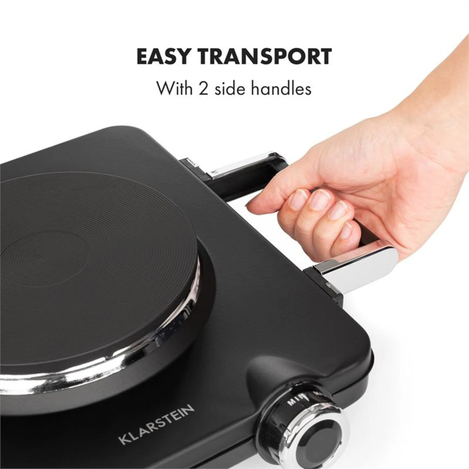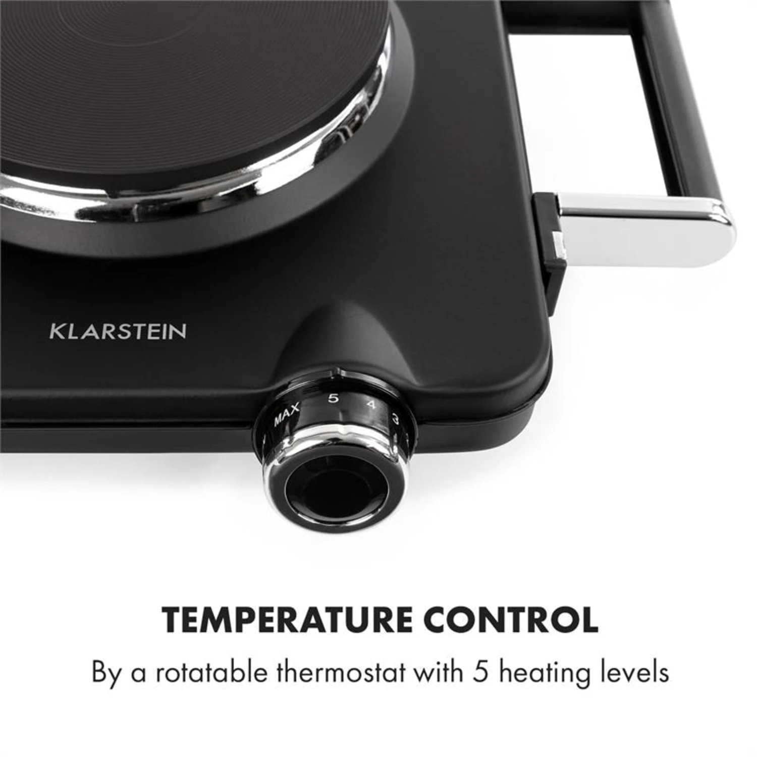 Die Heizleistung der Klarstein Cookorama Doppelkochplatte kann bequem mittels drehbarem Thermostat mit 5 Heizstufen reguliert werden. So werden Eintöpfe, Suppen und Schmorgerichte stets auf Idealtemperatur gebracht und konstant erhitzt. Doch auch bissfestes Gemüse und saftige Steaks kommen minutengenau gekocht auf den Teller: Mit 2 Gusseisenplatten mit 150 sowie 180 mm Durchmesser und einer Leistung zwischen 1900 und 2250 Watt erhalten alle Gerichte die benötigte Hitzezufuhr und können ideal zubereitet werden. 2 Haltegriffe erleichtern darüber hinaus den einfachen Transport, während 2 LED-Kontrollleuchten darüber Auskunft geben, welche Herdplatte momentan erhitzt wird.