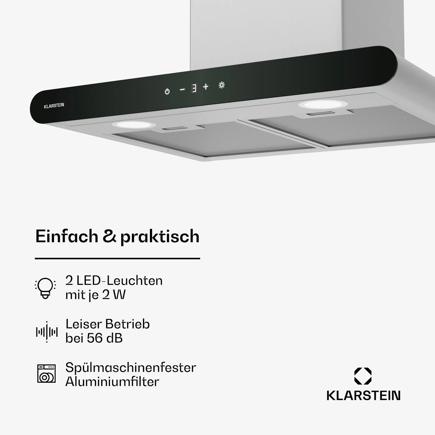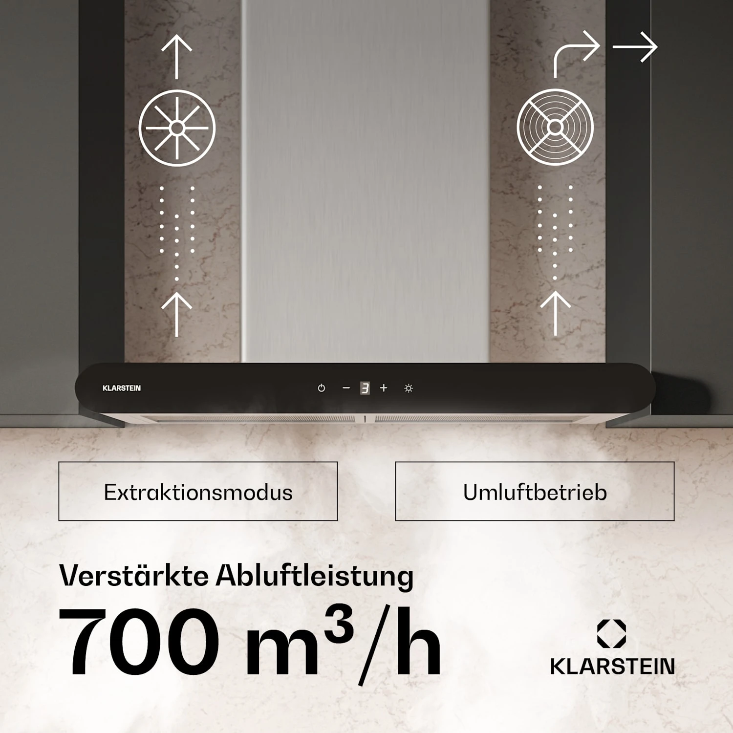 Die Klarstein CurveVent Dunstabzugshaube überzeugt durch ihren starken 110 W-Motor und eine Luftleistung von bis zu 700 m³/h, die für eine schnelle und gründliche Luftreinigung sorgt. Die Energieeffizienzklasse A+ garantiert dabei einen sparsamen Betrieb, ideal für den dauerhaften Einsatz. Dank der modernen Touch-Bedienung ist die Steuerung der Haube intuitiv und pflegeleicht.