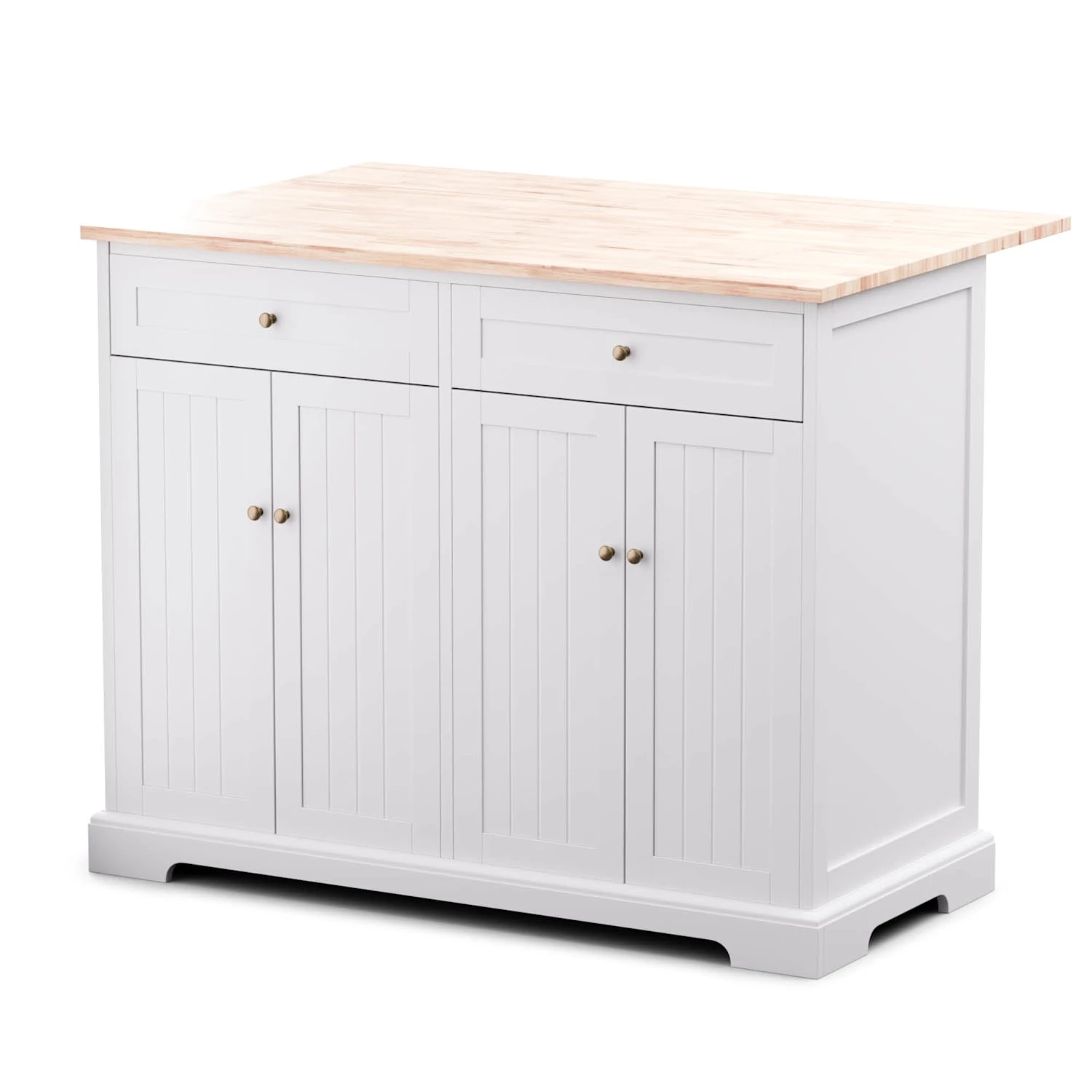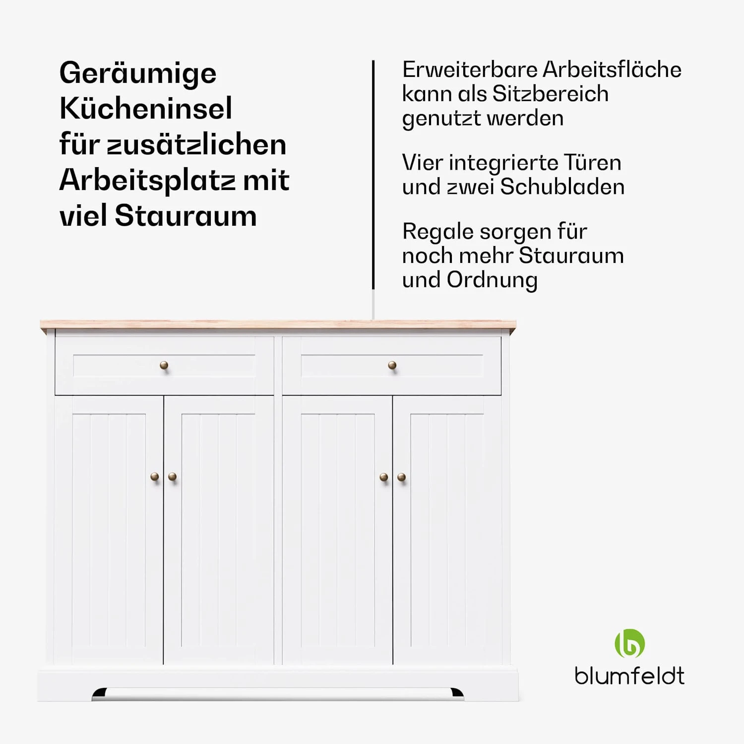 Dank der erweiterbaren Arbeitsplatte ist die Kücheninsel ideal für kleine Küchen, da sie zusätzlichen Platz zum Zubereiten von Mahlzeiten bietet. Die 2 Schubladen und 4 Türen ermöglichen eine organisierte Aufbewahrung von Küchenutensilien, während die erweiterbare Arbeitsfläche auch als gemütlicher Sitzbereich genutzt werden kann.
