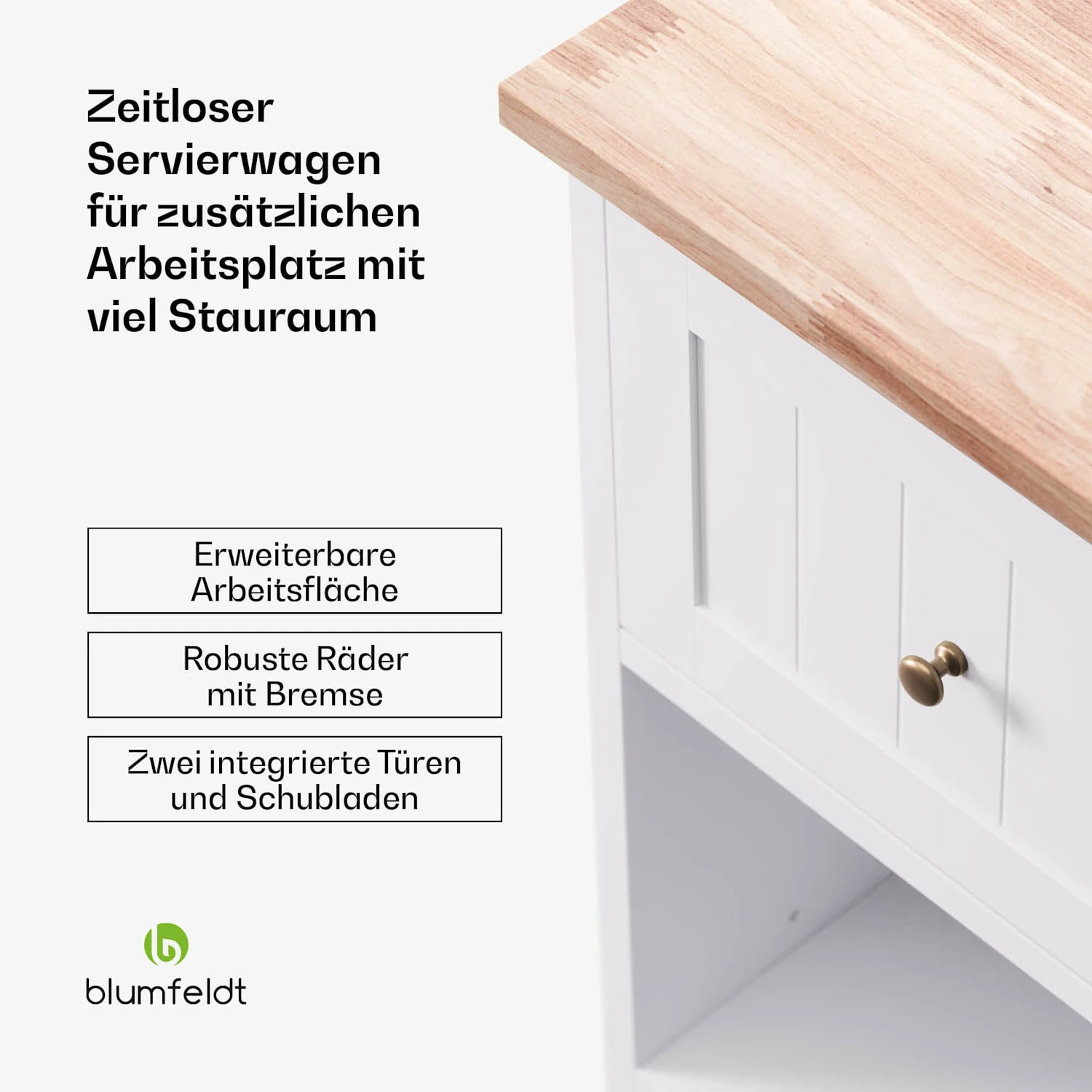 Dank seiner erweiterbaren Arbeitsfläche bietet der Servierwagen zusätzlichen Platz zum Vorbereiten von Mahlzeiten und zur Aufbewahrung von Küchenutensilien, was ihn besonders ideal für kleinere Küchen macht. Mit seinen 2 Schubladen, 2 Türen und 2 Regalen bietet er reichlich Stauraum für Geschirr, Besteck und andere Küchenutensilien.