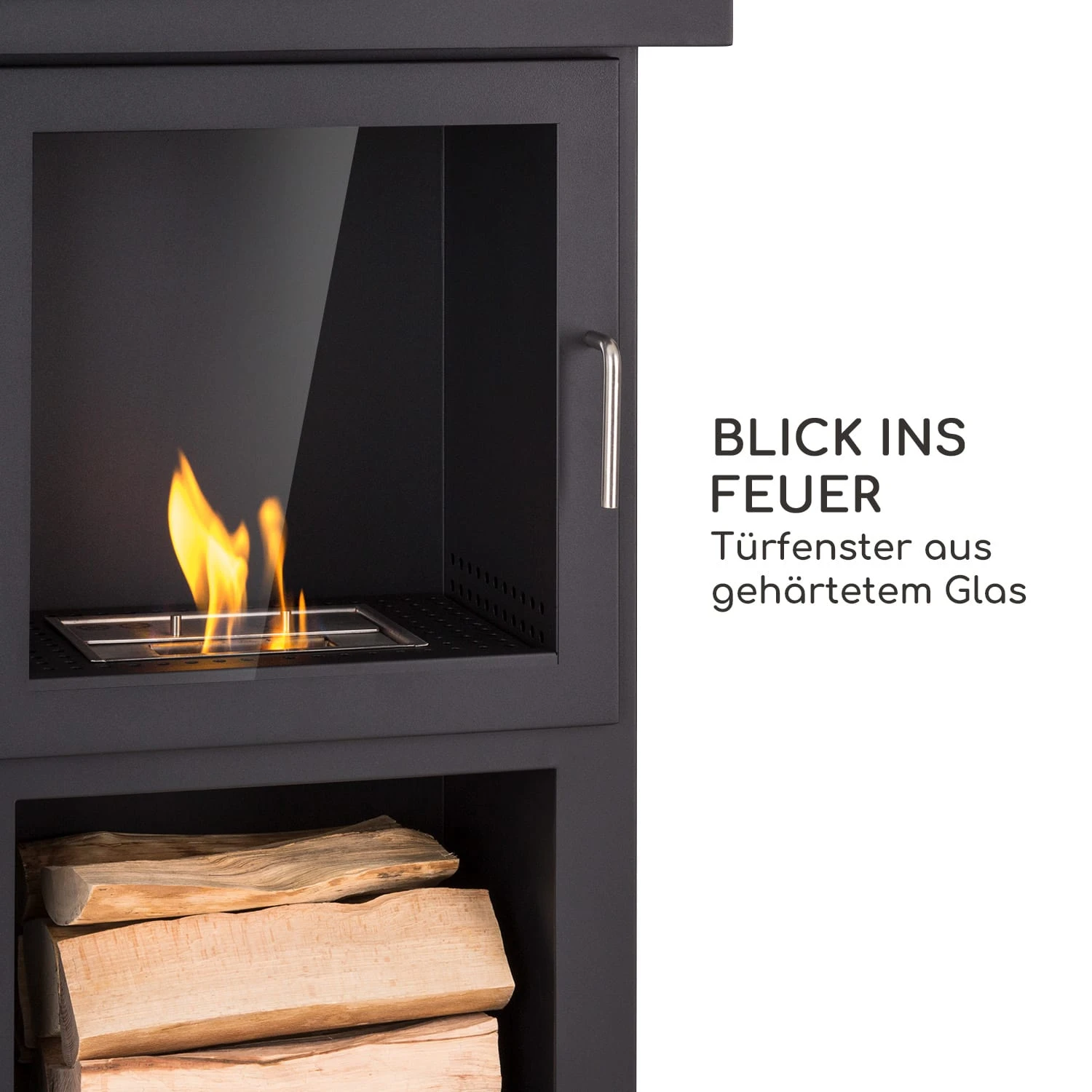 und durch die Glastür kannst du dabei ein fabelhaftes Flammenspiel betrachten.