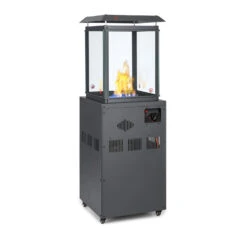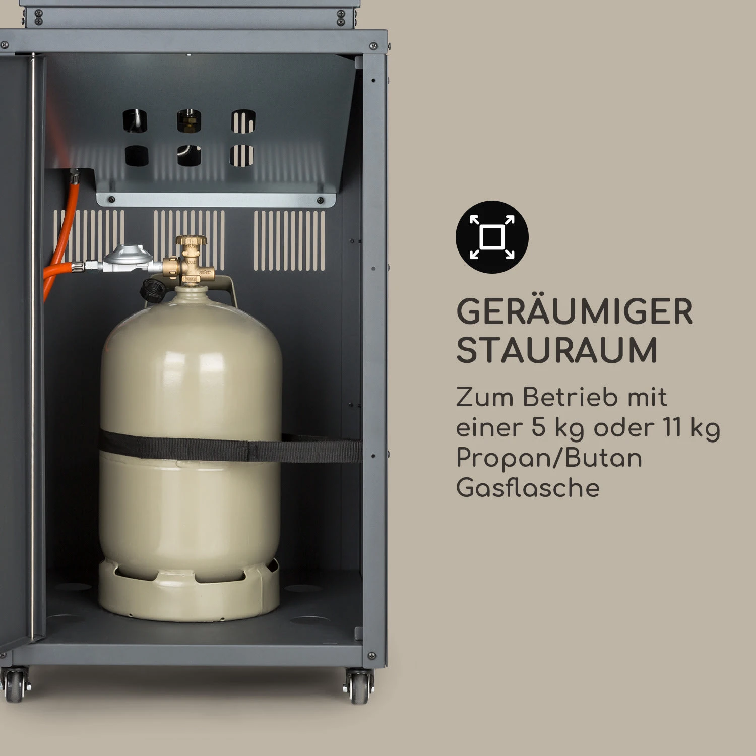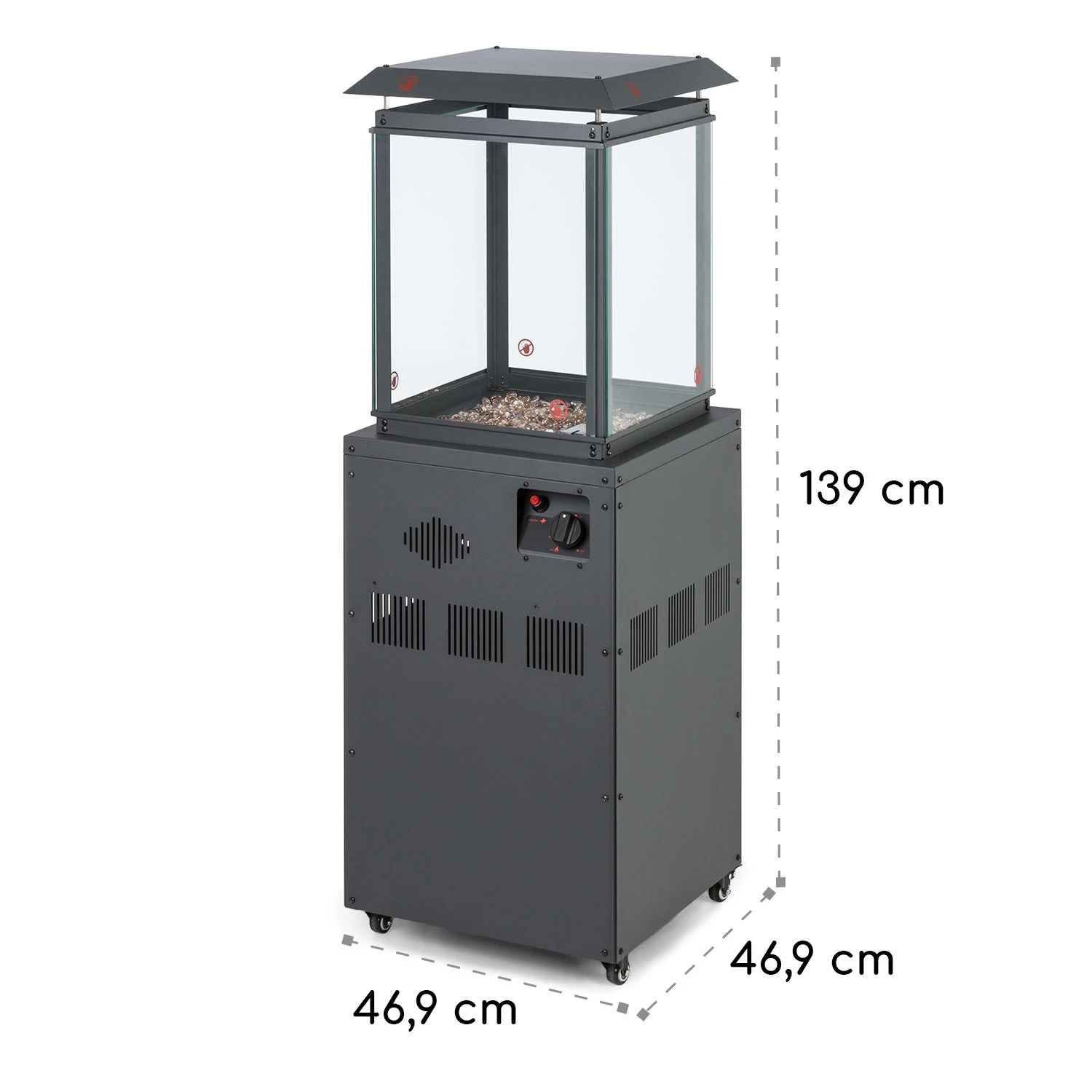 Leistungsstark und energieeffizient. Der blumfeldt Flagranti Gasheizstrahler ist zur Verwendung mit Propan- oder Butangefüllten Flüssiggasflaschen mit 5 oder 11 kg geeignet, die ganz einfach im geräumigen Innenraum Platz finden. Entfacht wird das Gerät unkompliziert über das integrierte elektrische Zündsystem. Mit einem mehrstufigen Regler wird die Zufuhr des Gases reguliert. Die Gasheizung erzeugt bis zu 8 kW Heizleistung und versorgt den Aufstellort sowie die Personen im näheren Umkreis schnell und effektiv mit angenehm wohliger Wärme. Im Mittelpunkt steht natürlich die ansehnliche Flamme, die durch 4 große Sichtfenster aus gehärtetem Glas zu sehen ist und umrandet von einer stilvollen Steindekoration für ein beeindruckendes und ungefährliches Schauspiel sorgt. Vier Bodenrollen erleichtern das Versetzen des blumfeldt Flagranti Gasheizstrahlers, während zuverlässige Feststellbremsen jederzeit den sicheren Stand der Konstruktion garantieren. Die korrosionsbeständige Bauweise aus Edelstahl macht das Gerät besonders langlebig und für die Aufstellung in Außenbereichen geeignet. Eine integrierte Sicherung unterbricht die Gaszufuhr zum Brenner falls dieser zu Kippen droht. So ausgerüstet erweitert er die Freiluftsaison um ein paar weitere Monate mit behaglichem Klima.