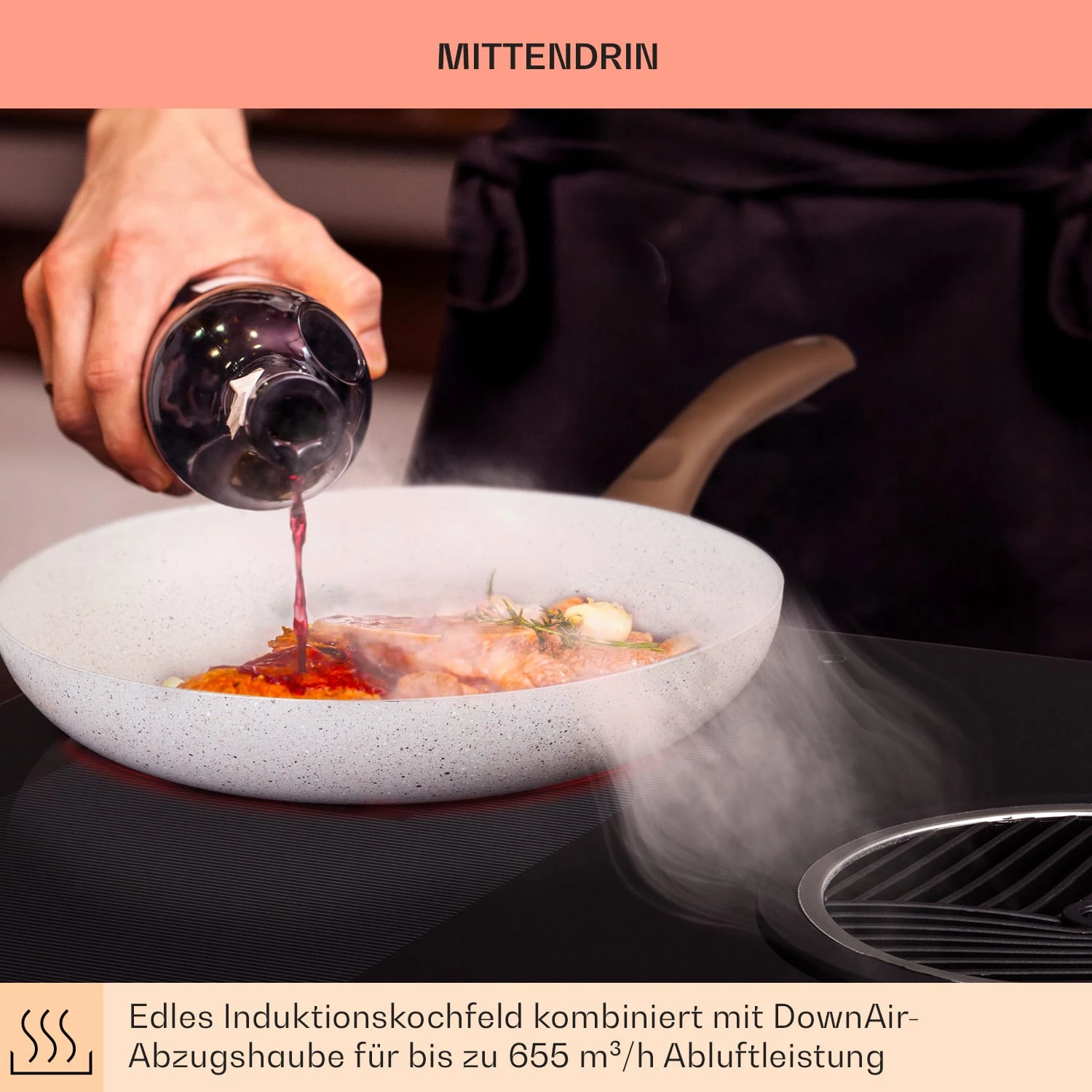 Mittendrin: edles Induktionskochfeld mit DownAir-Abzugshaube