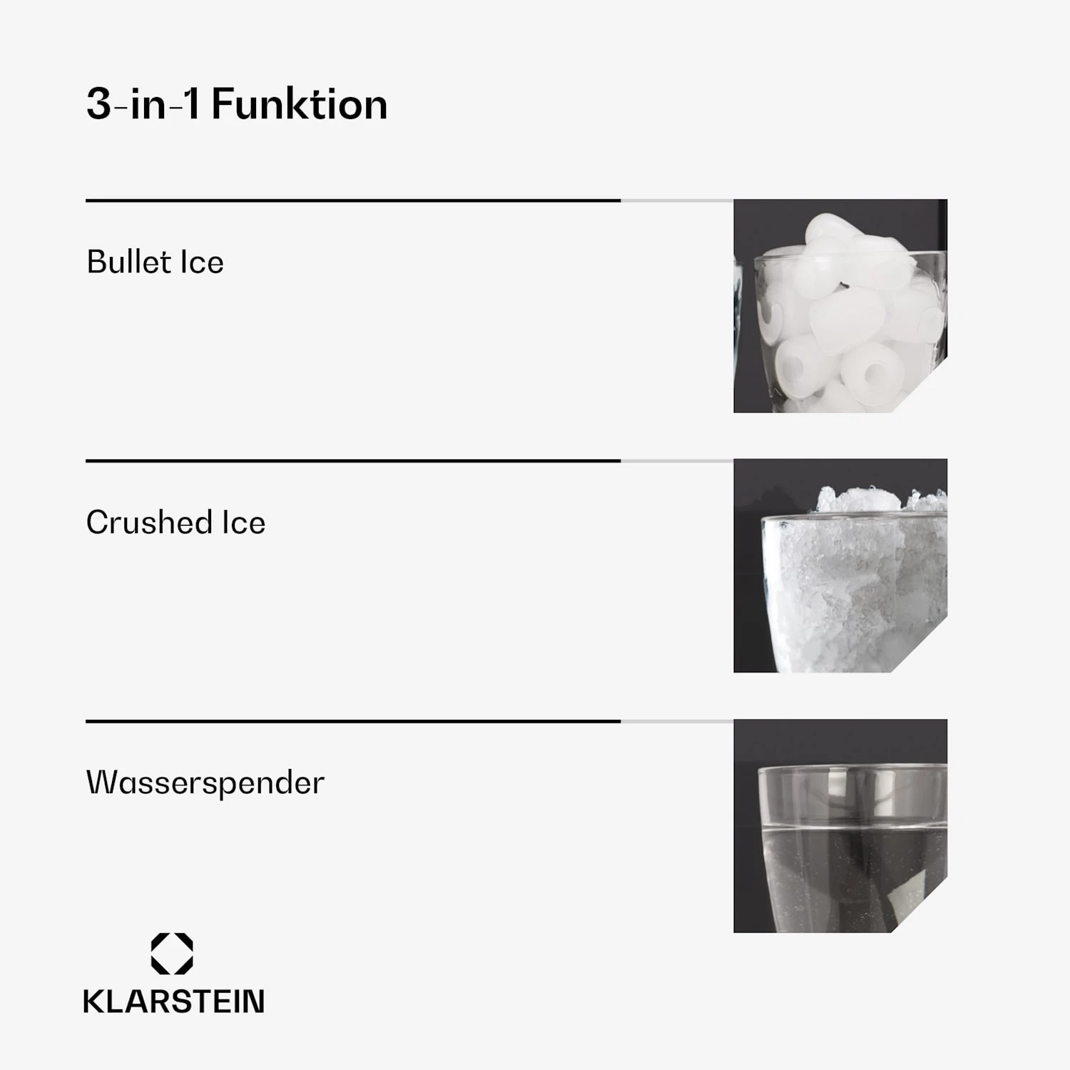 3-in-1 Funktionalität: Produziert Bullet Ice, Crushed Ice und dient als Wasserspender