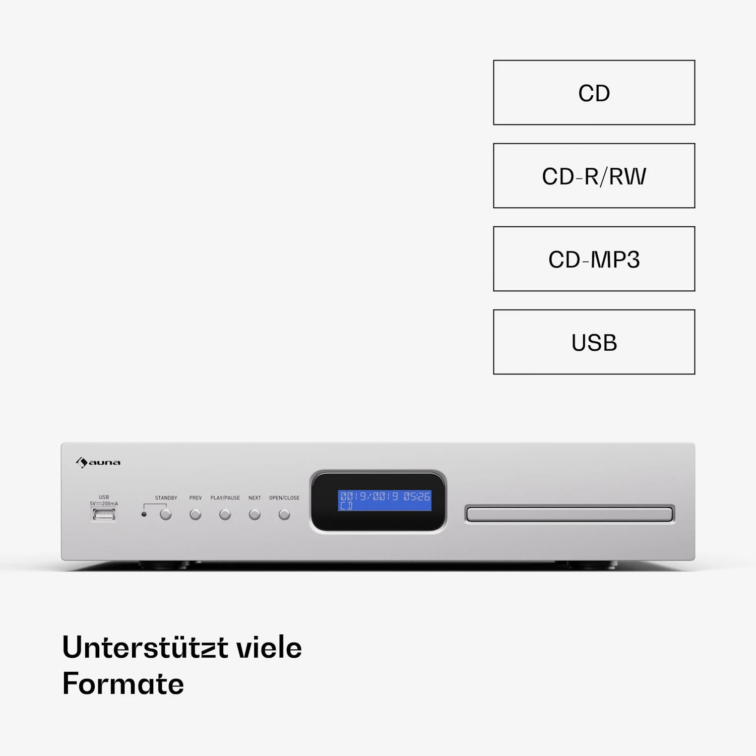 - Wiedergabe von CD, CD-R/RW, CD-MP3