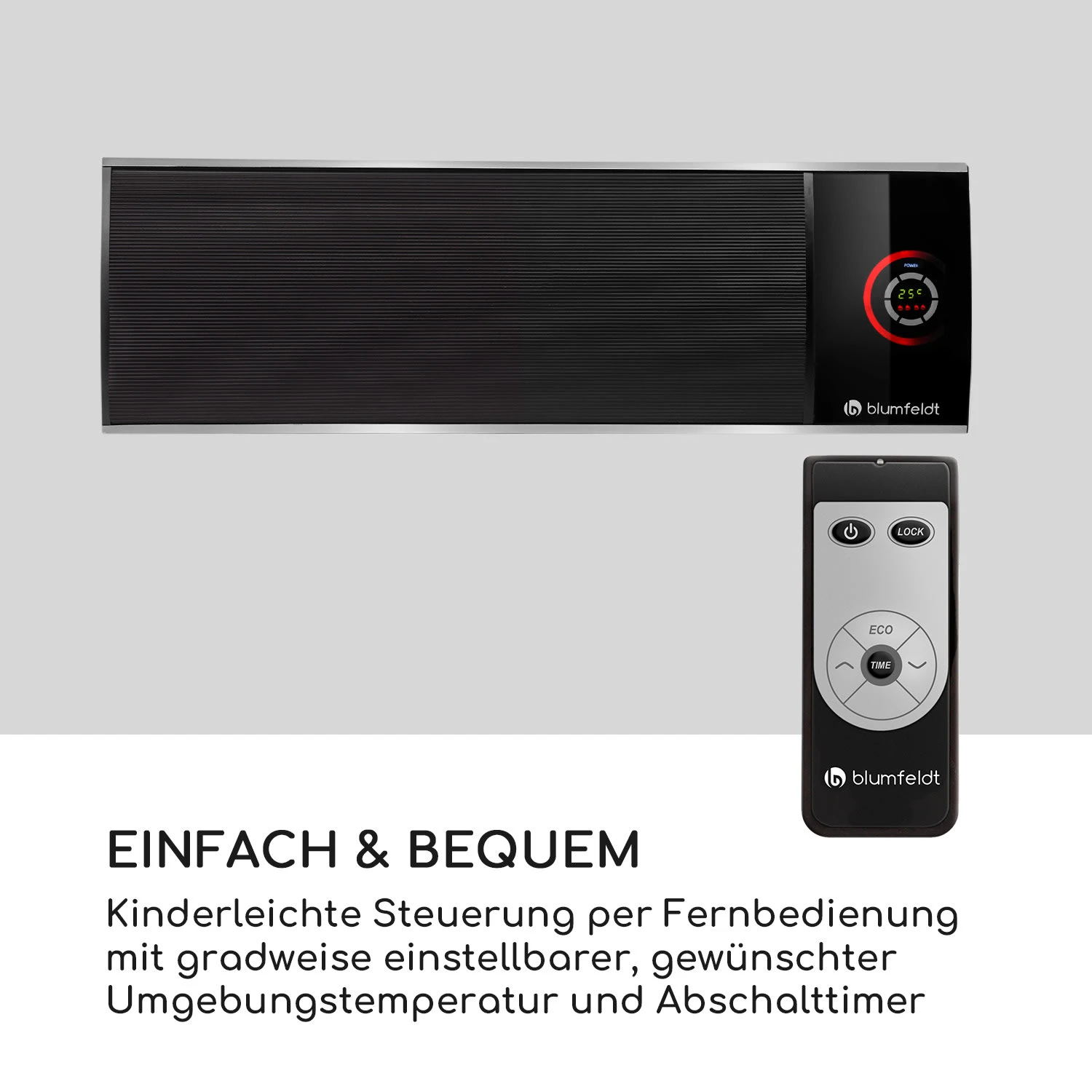 - Fernbedienung für bequemes Ein-/Ausschalten mit Tastensperre und ECO-Modus zum Abschalten des Displays