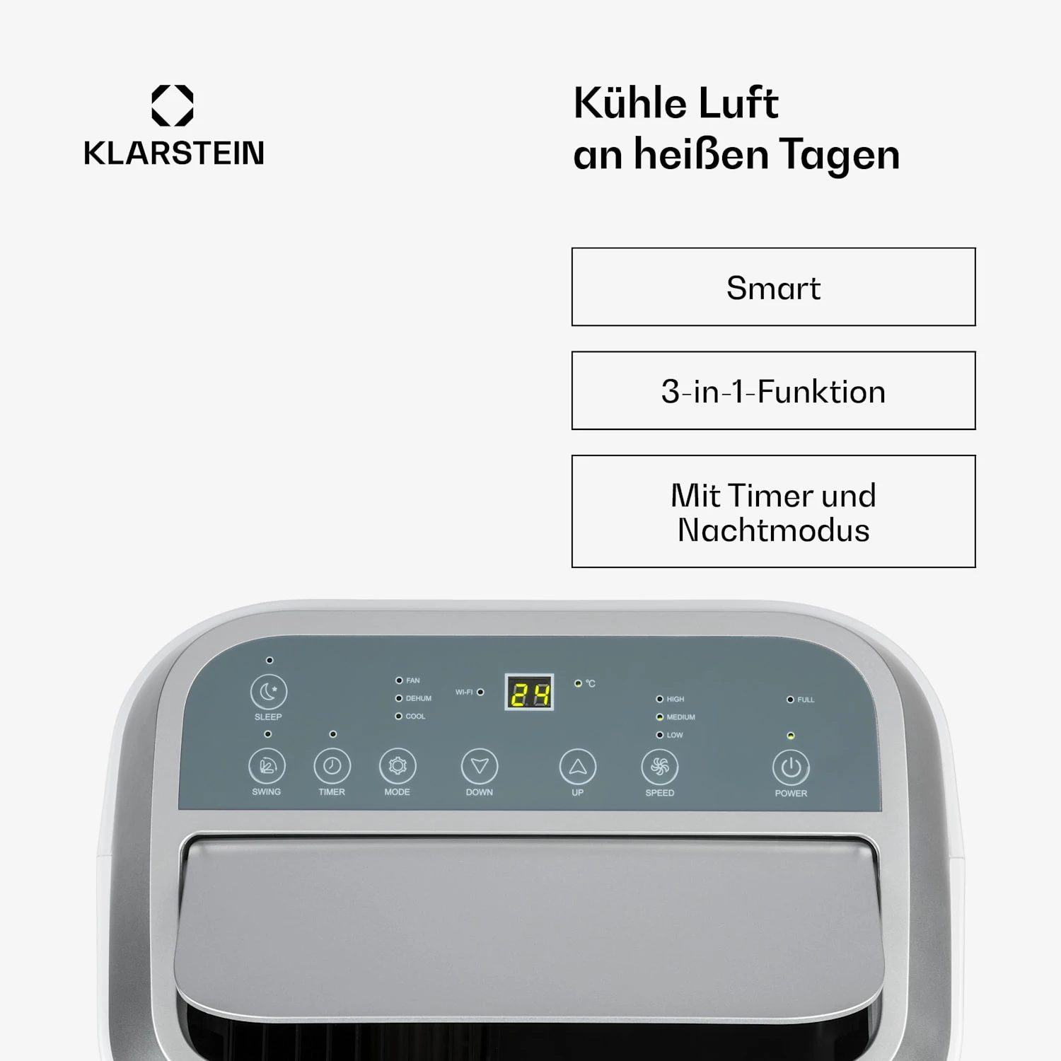 - Sleep Mode-Funktion: Betrieb auf niedrigster Geschwindigkeit, Absenken der Kühlleistung nach 1 und 2 h