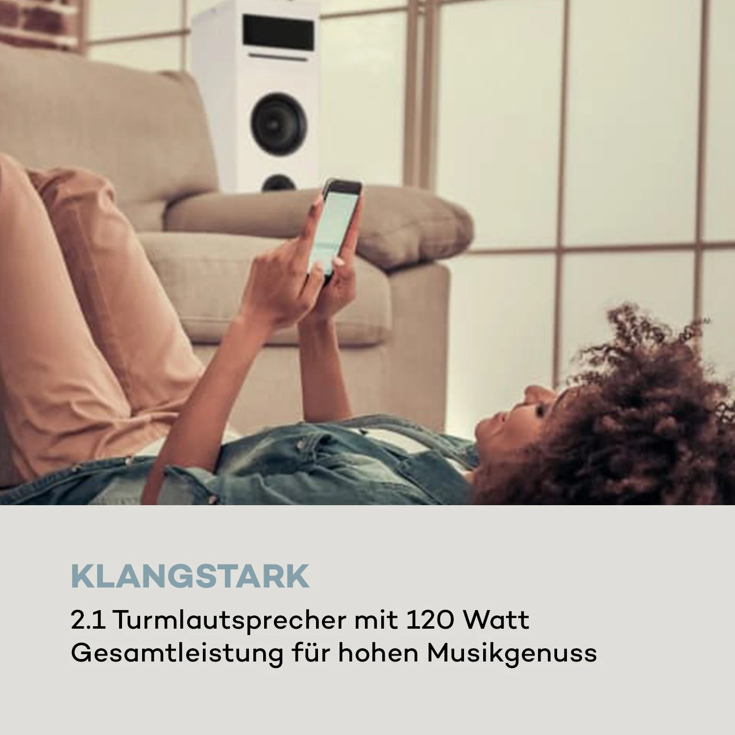 Klangstark: 2.1 Turmlautsprecher mit 120 Watt Gesamtleistung für hohen Musikgenuss