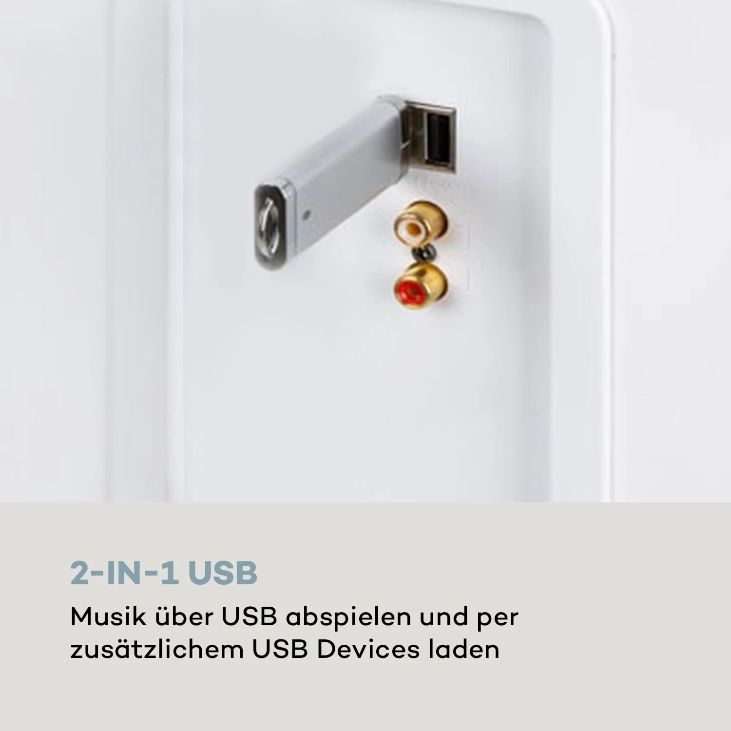 - Anschlüsse: AUX-Eingang, USB-Buchse, USB-Ladeanschluss