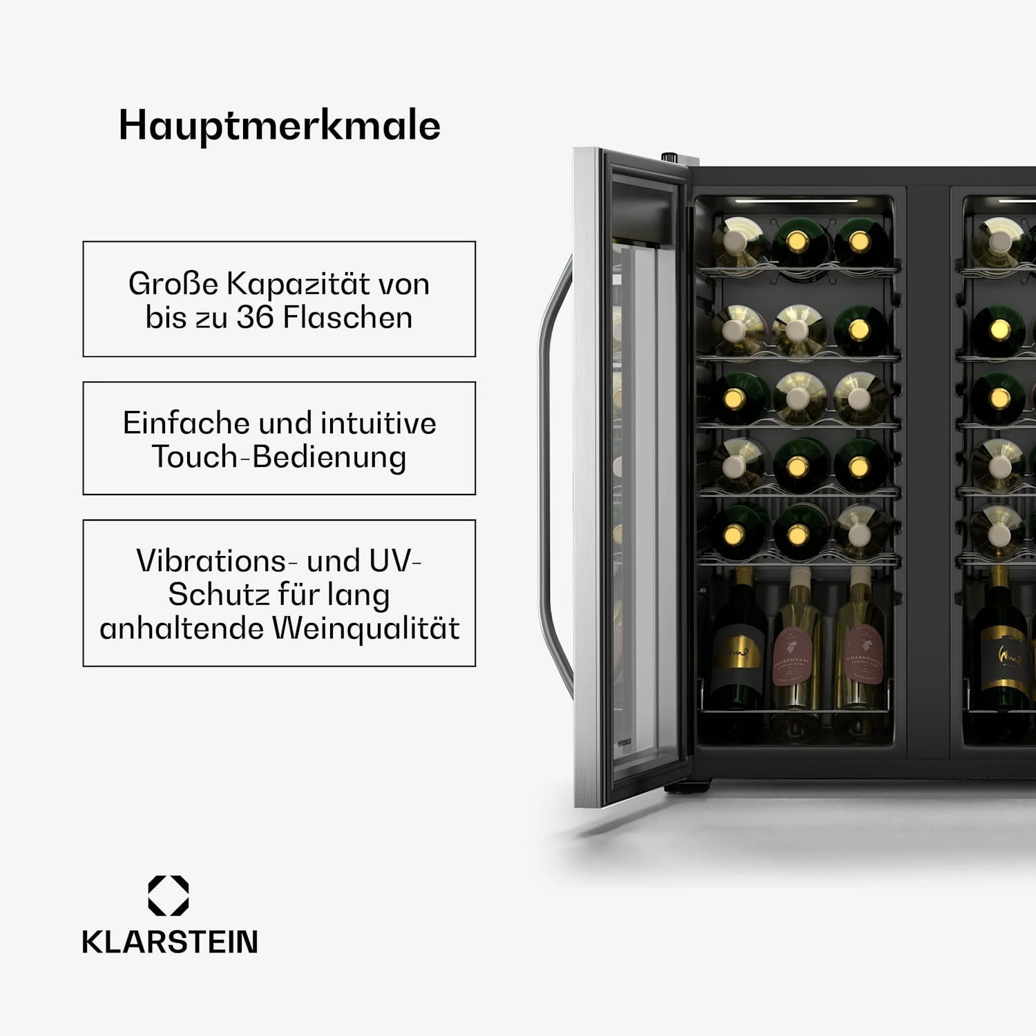 Hohe Kapazität: Platz für bis zu 36 Flaschen Ihrer Lieblingsweine, ideal für Sammler und Liebhaber, die eine vielseitige Auswahl immer griffbereit haben möchten.