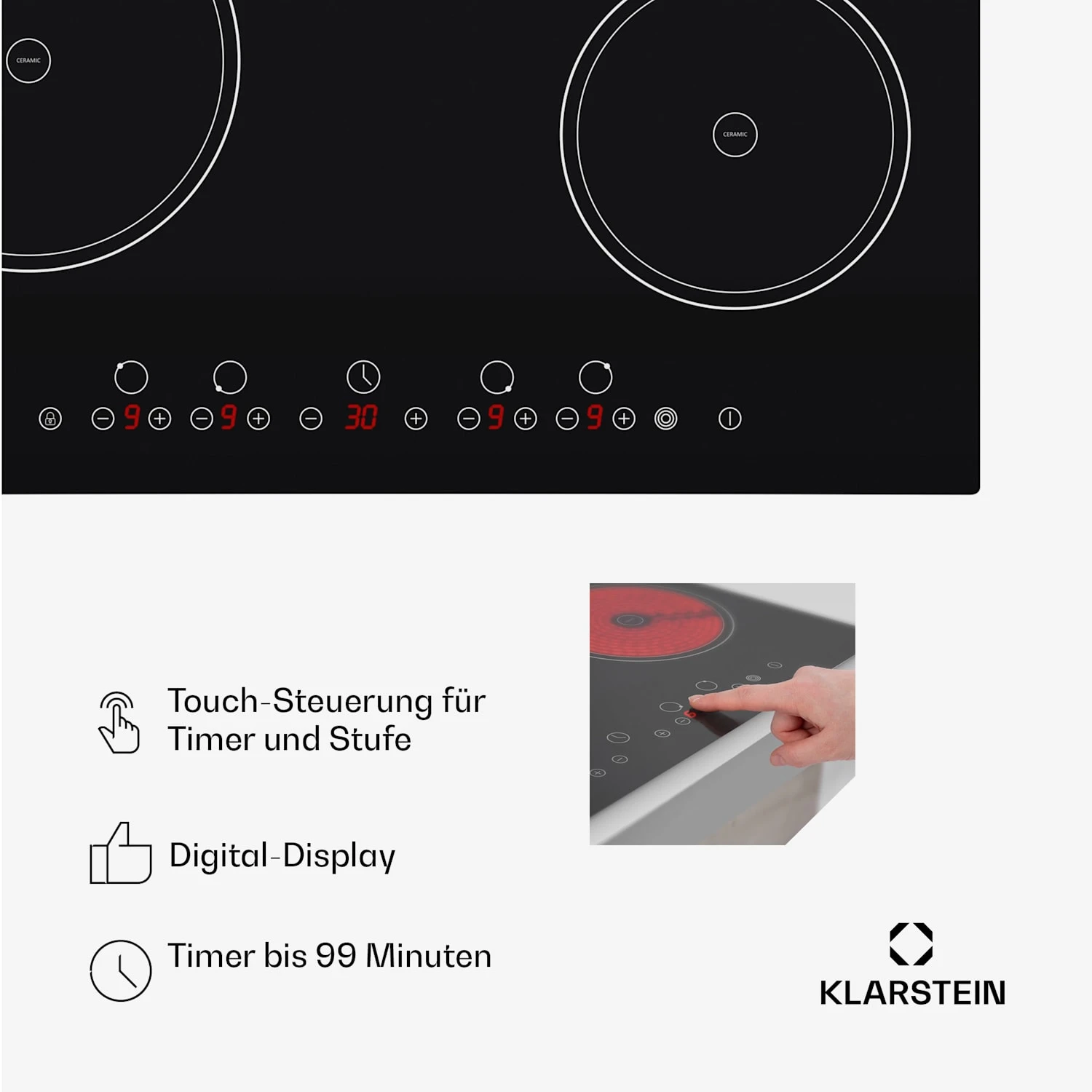 - Timer in Minuten- oder 10-Minuten-Schritten einstellbar bis 99 Minuten