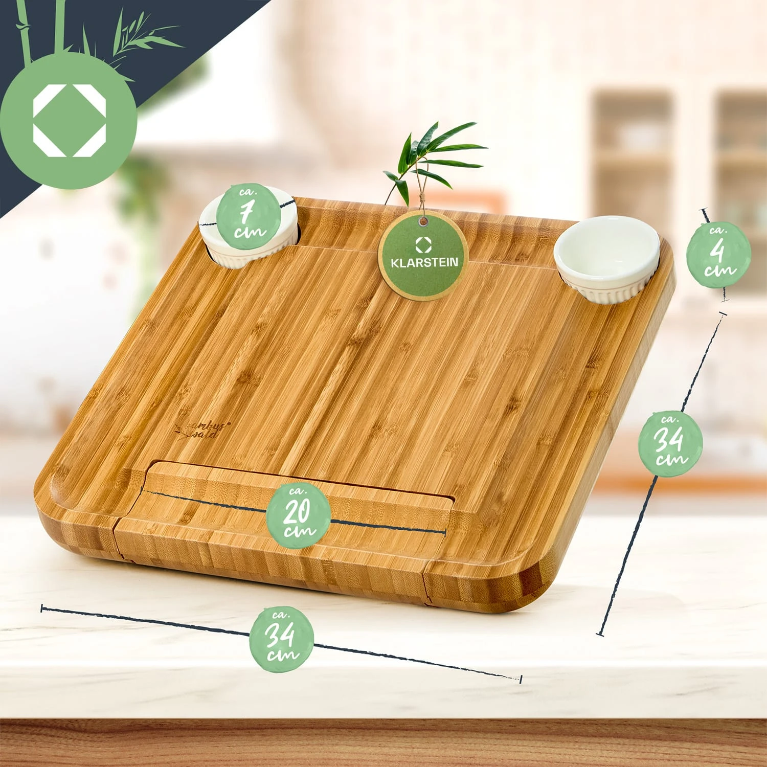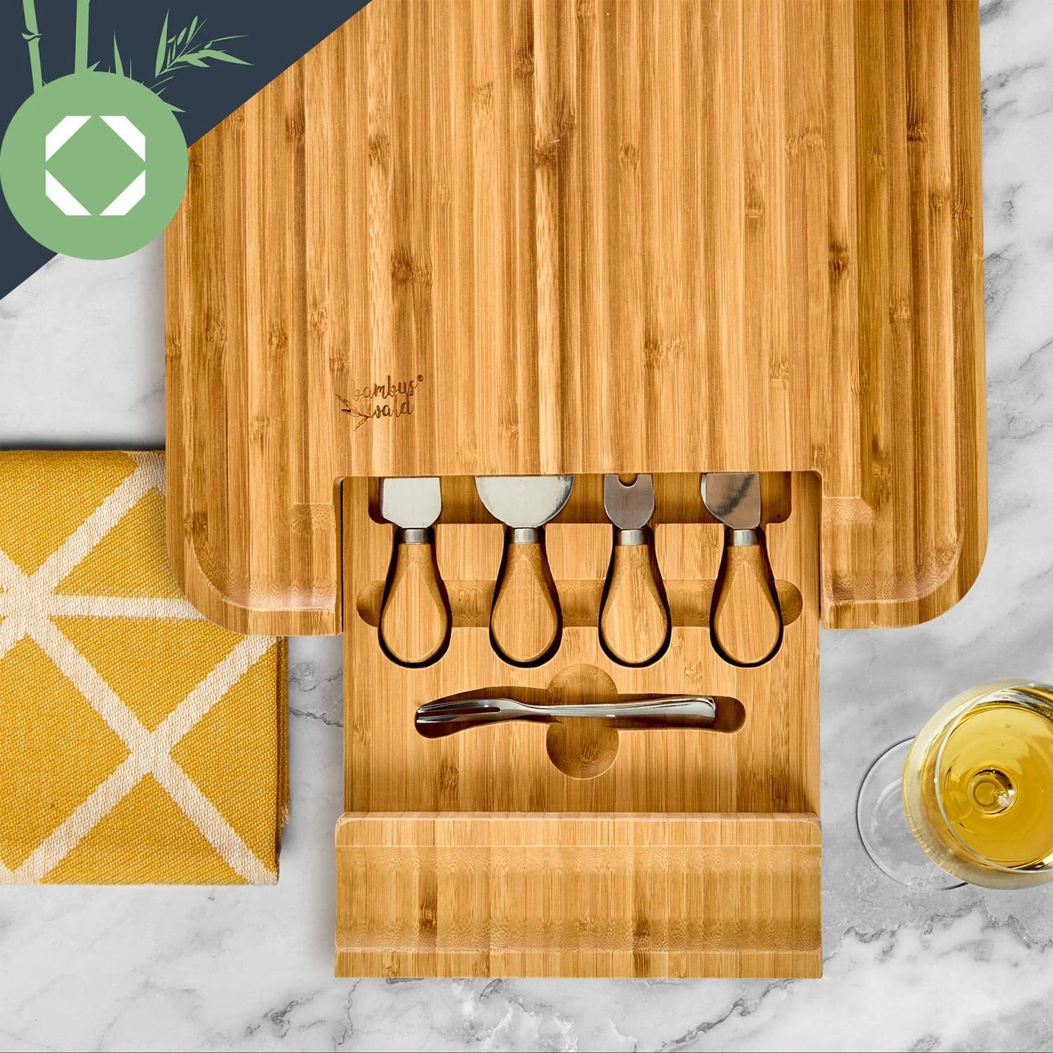 - Quadratische Käseservierplatte aus Bambus mit Besteckschublade