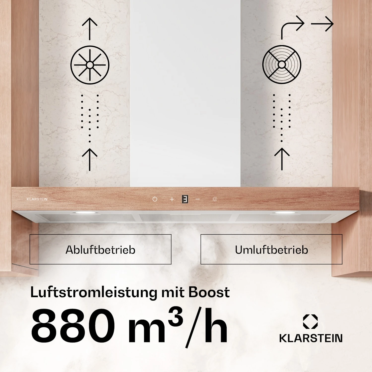 Leistungsstarker Boost-Modus: Entfernt selbst starken Dampf und Gerüche mit einer Luftleistung von bis zu 881,6 m³/h