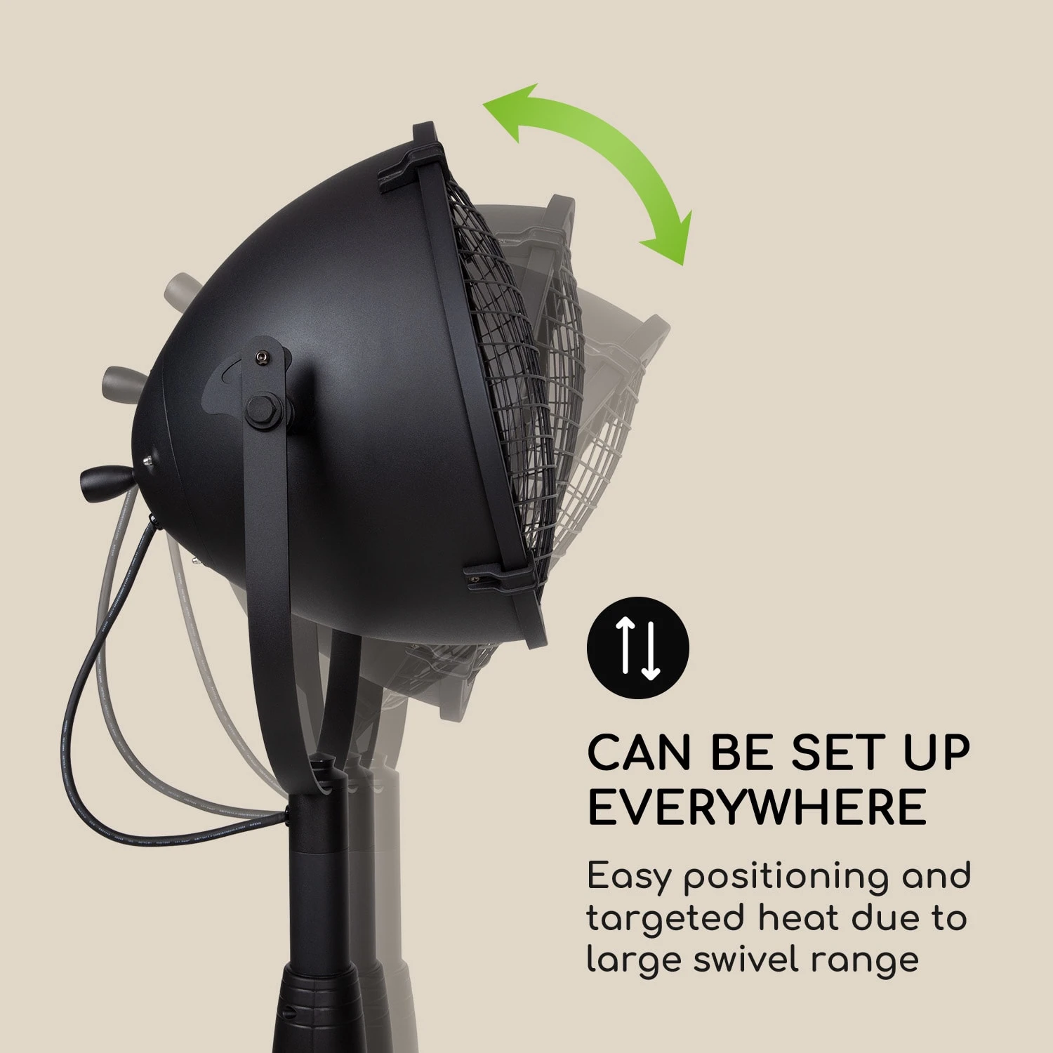 Der Heizstrahler lässt sich überall flexibel aufstellen, während er zügig und effizient mit bis zu 2100 Watt wärmt. Das Infrarot-Carbon-Heizelement mit IR Comfort Heat liefert nicht nur sehr schnell Wärme, es gibt sie dank Infrarotstrahlung auch gezielt an in der Nähe befindliche Personen und Gegenstände ab, ohne die Luft aufzuheizen. Zusätzlich besitzt der Heizkopf einen großen Schwenkbereich und lässt sich leicht positionieren, was den Heizstrahler noch praktischer macht.