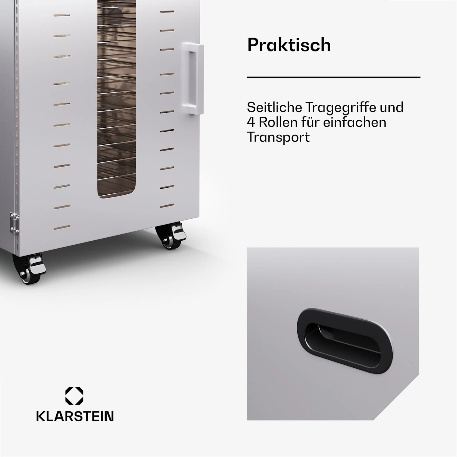 Mit seiner enormen Heizleistung von 3.000 Watt und der gleichmäßigen Hitzeverteilung dank 4 Ventilatoren (zwei in jeder Dörrkammer) sorgt der Klarstein Master Jerky 500 Vertical Dörrautomat dafür, dass Lebensmittel optimal getrocknet werden und die Trockenzeit kurz bleibt. 32 herausnehmbare Einschübe aus Edelstahl bieten jeweils 40 x 38 cm Platz für eine Gesamttrockenfläche von 4,86 m². Als besonders praktisch erweisen sich die zwei separaten Dörrkammern, die unabhängig voneinander gesteuert werden können. Perfekte Bedingungen zur professionellen Trocknung z.B. in Spezialitätengeschäften für Beef Jerky, Tees oder Trockenobst. Für die flexible Zubereitung unterschiedlicher Lebensmittel lässt sich am Touch-Bedienpanel die Temperatur zwischen 30 und 90 °C einstellen. Ein Timer bis 24 Stunden garantiert zusätzlich die optimale Abstimmung auf die zu trocknende Nahrung.