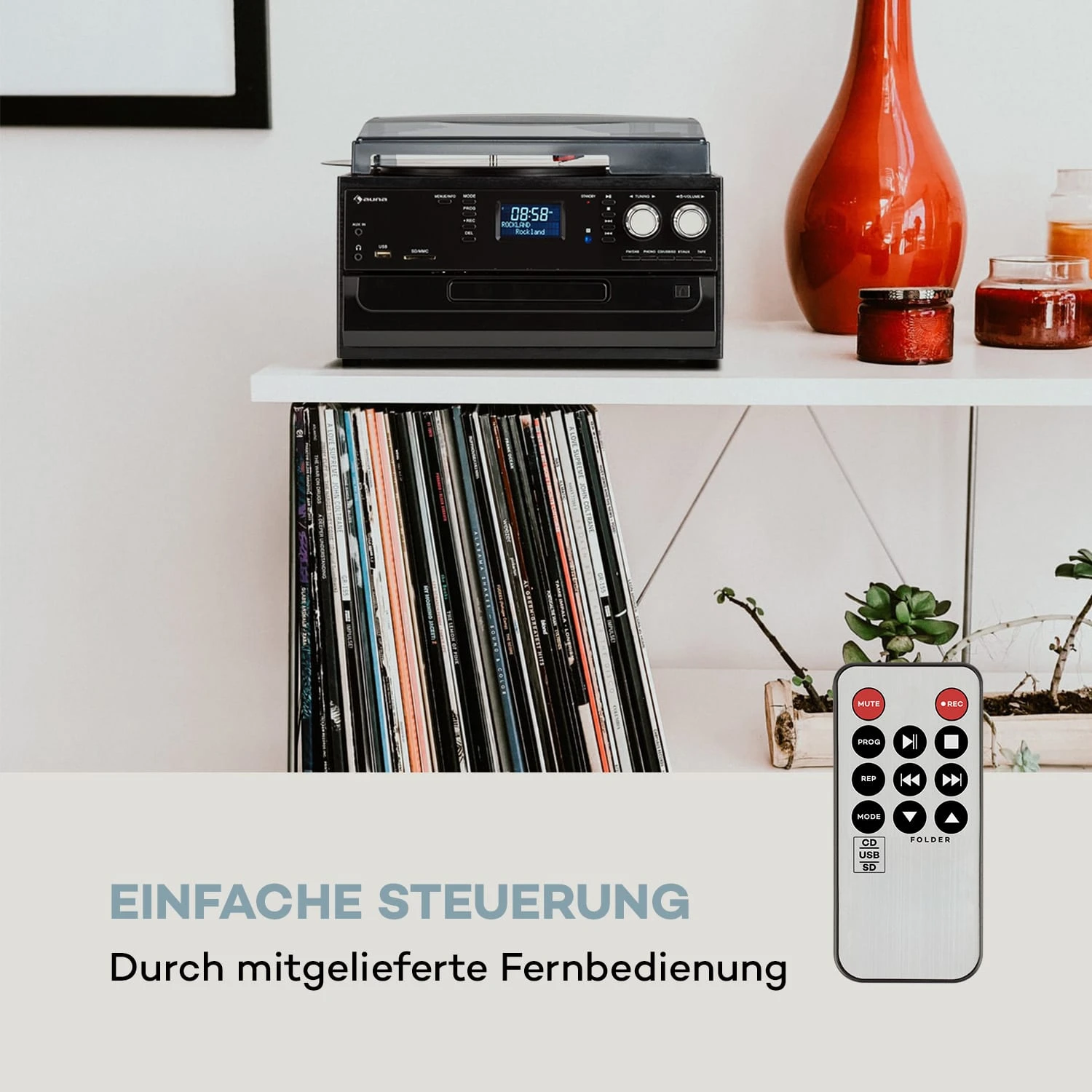Den Mittelpunkt der Retro-Stereoanlage bildet der unter einem Schutzdeckel verborgene Plattenspieler, der zusammen mit dem seitlich verbauten Kassettendeck und dem MP3-fähigen CD-Player alle musikalischen Leitmedien seit dem frühen 20. Jahrhundert abdeckt. Ein Plattenspieler mit einem Riemenantrieb und drei Geschwindigkeiten von 33, 45 & 78 Umdrehungen pro Minute hält die auna-Stereoanlage somit ebenso in der täglichen Rotation, wie Kassetten und CD-Medien. Seine Anschlussfähigkeit an moderne Mediengewohnheiten bezeugt das Gerät mit frontseitig verbauten USB- und SD-Anschlüssen, mit deren Hilfe die Tonspuren von Kassette, CD oder Platte ohne viel Aufhebens direkt als MP3-Datei auf USB- bzw. SD-Datenträgern aufgezeichnet werden können. Auf dem Weg in die Zukunft begegnet man einem FM/DAB+ Radiotuner, der neben lokalen Signalen auch digitale Sender in hoher Klangqualität und ohne Rauschunterbrechungen empfängt. Vollkommen in der Moderne angekommen fühlt man sich jedoch erst mit der Bluetooth-Funktion, durch die sämtliche Audio-Dateien von Smartphone oder Tablet drahtlos und bequem über die auna Oakland DAB Retro-Stereoanlage wiedergegeben werden können. Dank ihrer vielen Funktionen und integrierten Lautsprechern erweist sich die auna Oakland DAB Retro-Stereoanlage als überaus platzsparende HiFi-Komplettlösung, die sich gerade auch in Wohnbereichen mit beschränktem Platzangebot wohlfühlt. Die integrierten Stereo-Lautsprecher der auna-Mikroanlage zeichnen dabei ein aussagekräftiges Klangbild, das sich über den Line-Ausgang Rückendeckung bei einem externen HiFi-Verstärker holt.