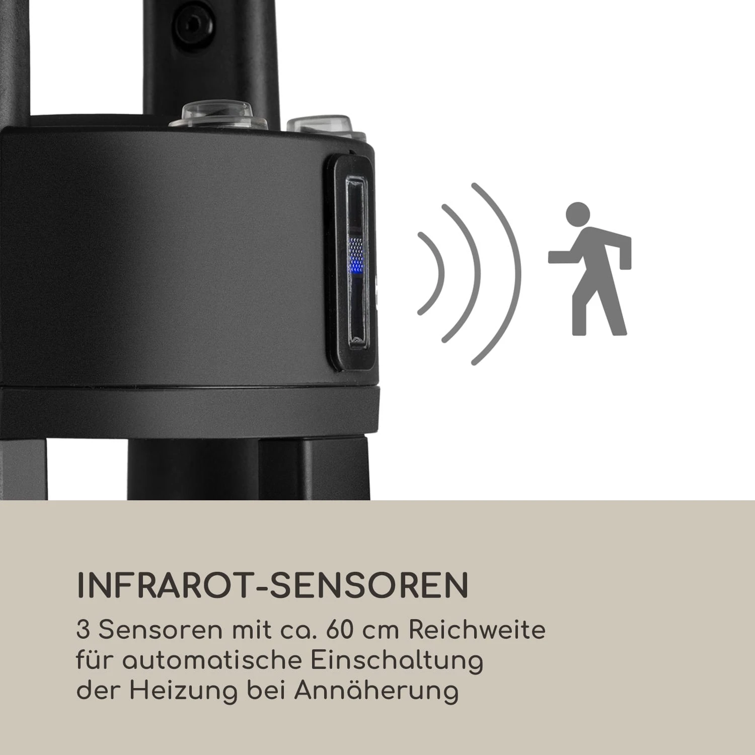 Infrarot-Sensoren: 3 Sensoren mit ca. 60 cm Reichweite für automatische Einschaltung der Heizung bei Annäherung