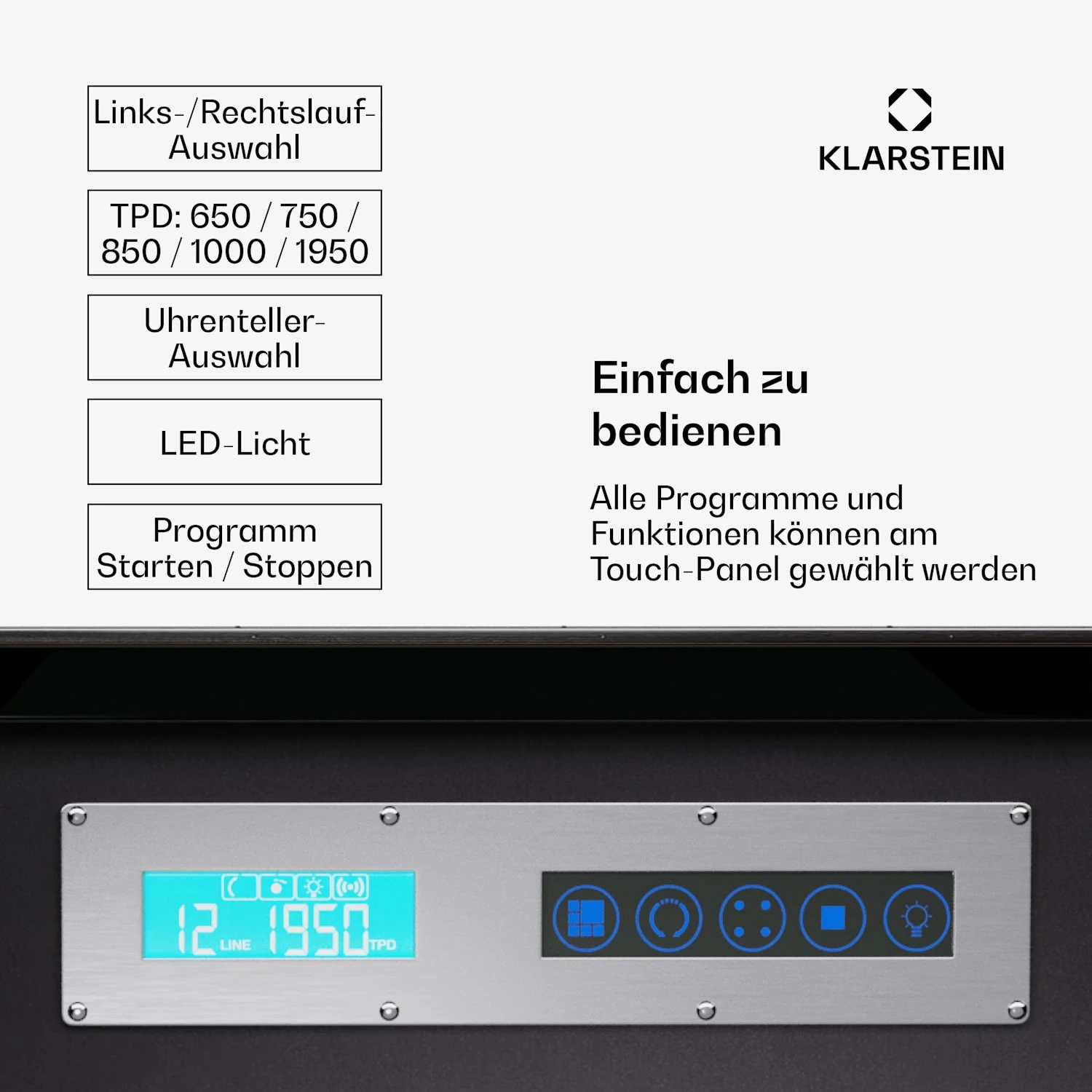 LCD-Display & Key Lock und TDP Auswahl: Das Touch-Panel ermöglicht eine einfache Auswahl aller Programme und Funktionen. Mit der Key Lock-Funktion bleibt der Inhalt sicher verwahrt. Wähle aus 3 Rotationsmodi und 5 TPD-Optionen