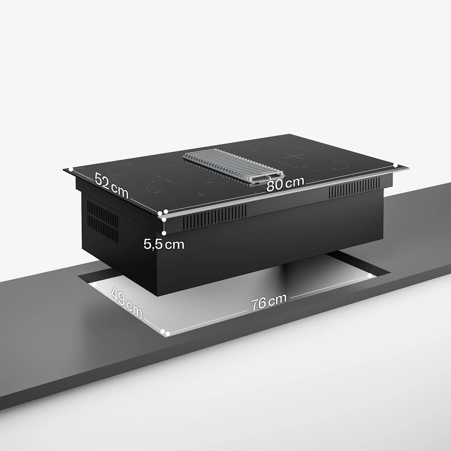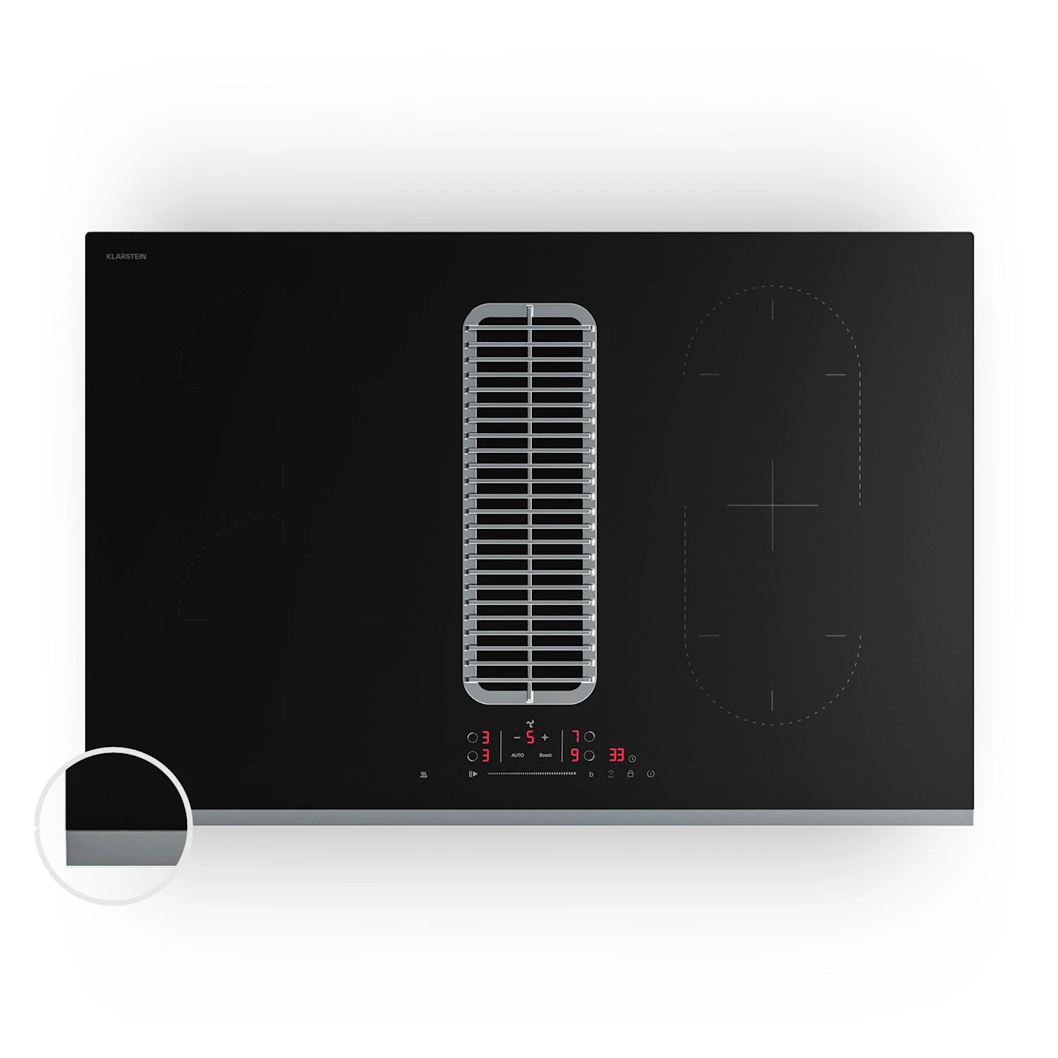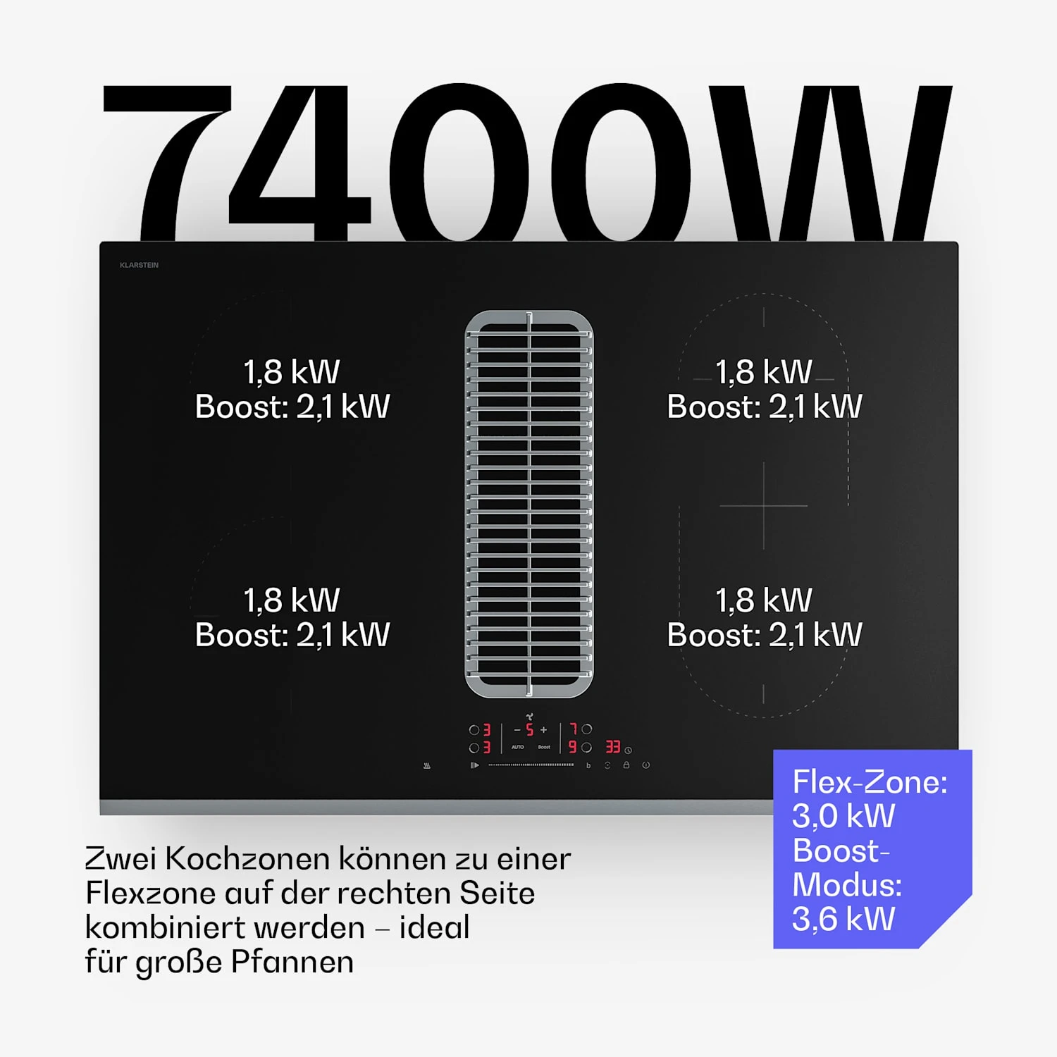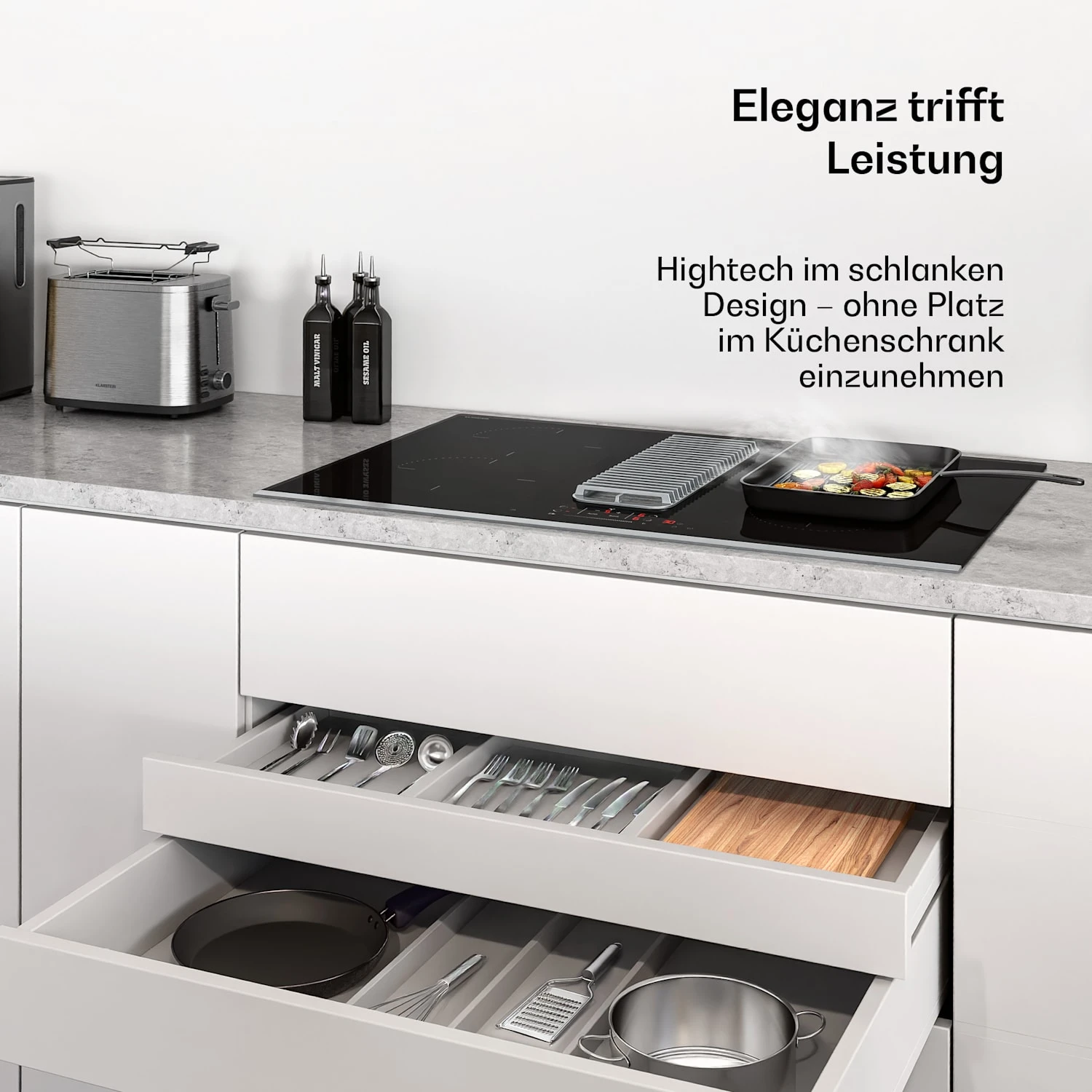 Das Klarstein Verosteel Induktionskochfeld mit integrierter Abzugshaube vereint minimalistisches Design mit kraftvoller Leistung und energieeffizienter Technologie. Das Design überzeugt mit einer edlen Kombination aus glänzendem schwarzem Glas und Edelstahl, so werden hochwertige und langlebige Materialien mit einer leicht zu reinigenden Oberfläche miteinander vereint. Dieses Kochfeld ist Teil der Verosteel-Designserie und verkörpert Minimalismus, Ruhe und klare Geometrie. Damit wird es zum natürlichen Herzstück jeder Küche. Vier leistungsstarke und hochwertige Induktionskochzonen mit einer Gesamtleistung von bis zu 8400 W im Boost-Modus und die integrierte Abzugshaube mit einem maximalen Luftdurchsatz von 590 m³/h garantieren ein entspanntes Kocherlebnis. Mit dem Touch-Schieberegler ist das Kochfeld einfach und intuitiv zu bedienen. Die sichere Verwendung wird durch eine Kindersicherung und eine Restwärmeanzeige garantiert. Dank seiner ThermoRecall-Funktion kehrt das Induktionskochfeld nach einer Unterbrechung – etwa durch den integrierten Timer – automatisch zur zuletzt genutzten Temperatureinstellung zurück. Die Topferkennung erleichtert das Kochen, indem sie dafür sorgt, dass die Kochzone nur aktiviert wird, wenn ein geeigneter Topf oder eine geeignete Pfanne verwendet wird. Zudem verhindert sie, dass sich die Kochfläche unnötig erhitzt, wenn kein Topf auf dem Kochfeld steht. Du möchtest deine Küche mit schlichter Eleganz einheitlich einrichten? Entdecke jetzt unsere gesamte Verosteel-Geräteauswahl und kreiere ein elegant-harmonisches Küchenerlebnis!