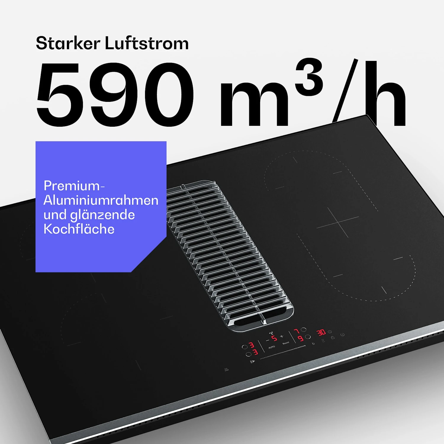 Hohe Leistung: Maximaler Luftdurchsatz von 590 m³/h und Kochfeld-Gesamtleistung von 8400 W (im Boost-Modus) für schnelles und punktgenaues Kochen.