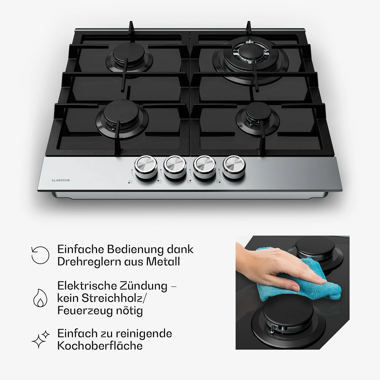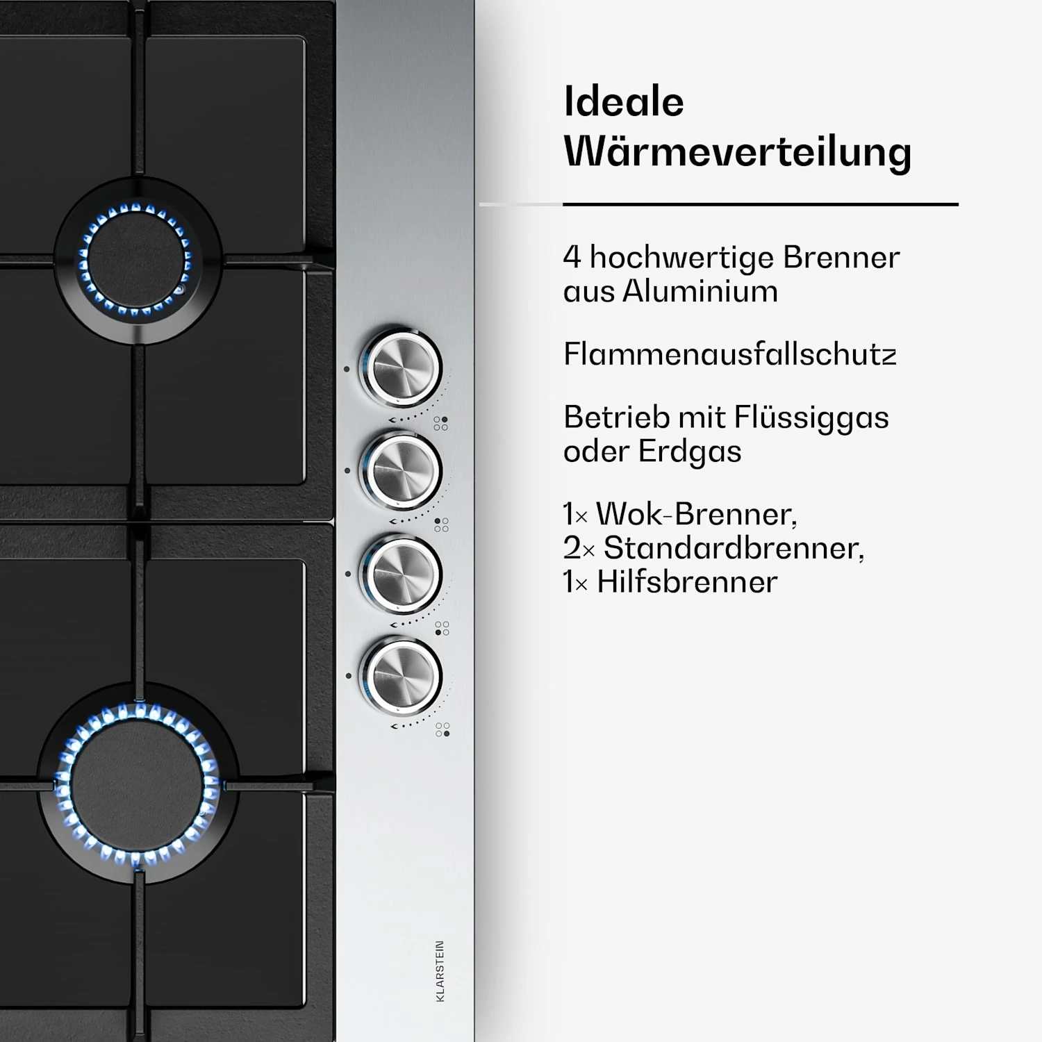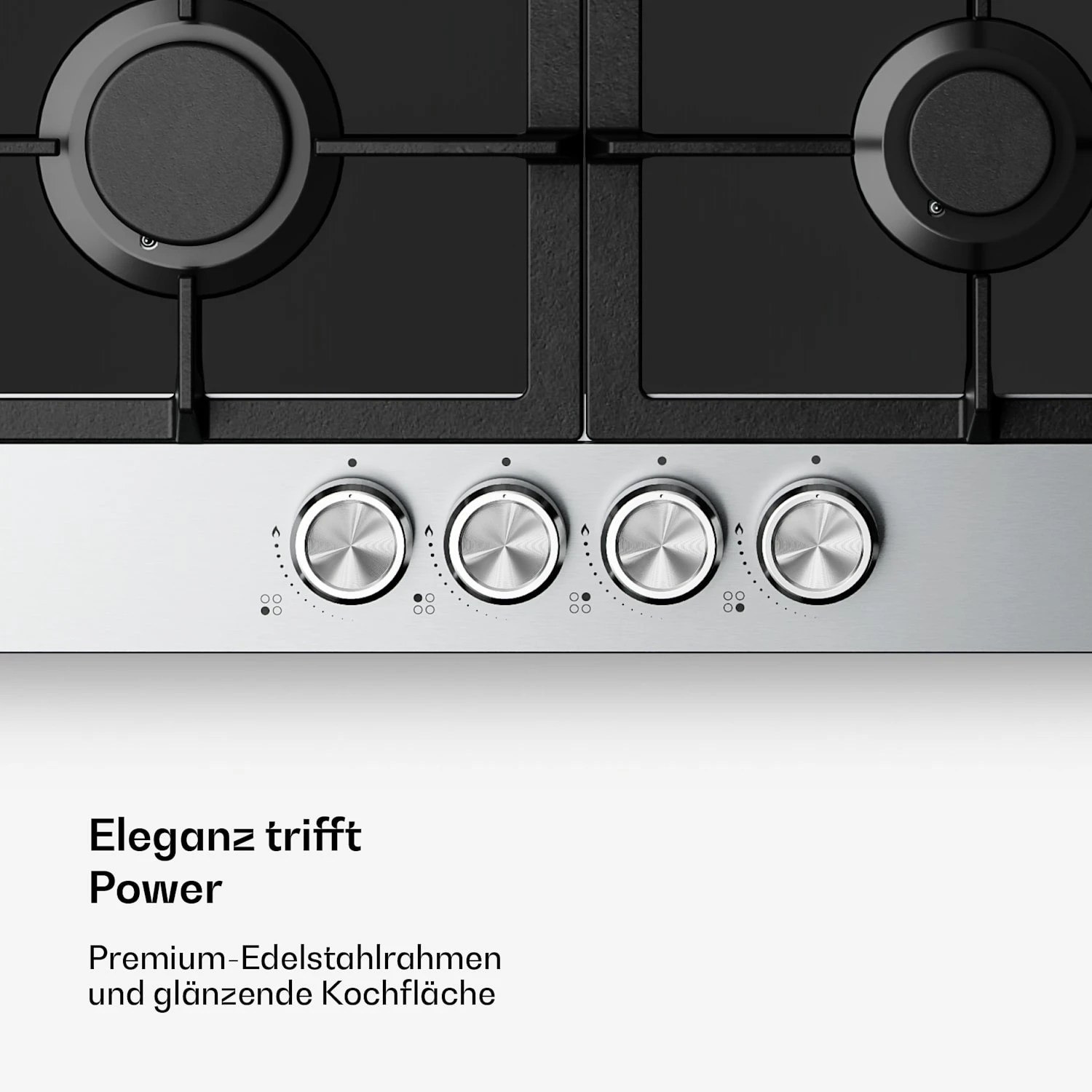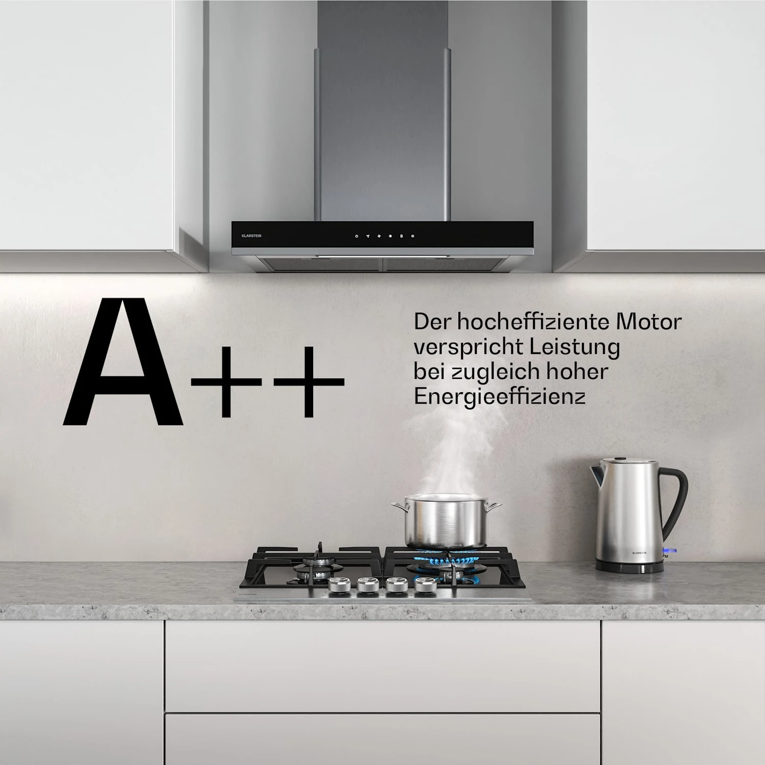 Das Klarstein Verosteel Set aus Gaskochfeld und Kaminhaube vereint minimalistisches Design mit kraftvoller Leistung und energieeffizienter Technologie. Mit einer edlen Fusion aus glänzendem Schwarzglas und Edelstahloberfläche kombiniert es hochwertige und langlebige Materialien mit leicht zu reinigenden Oberflächen. Als Teil der Verosteel Designserie verkörpert dieses Set Minimalismus, Ruhe und klare Geometrie und ist damit ein natürliches Herzstück jeder Küche. Vier leistungsstarke und hochqualitative Brenner mit einer Gesamtleistung von 8000 W garantieren ein reibungsloses Kocherlebnis. Dank metallener Drehknöpfe ist das Gaskochfeld einfach zu benutzen, während die elektrische Zündung Streichhölzer oder ein Feuerzeug überflüssig macht. Das Gerät kann sowohl mit LPG- als auch mit Erdgas betrieben werden. Ausgestattet mit heller LED-Beleuchtung, bietet die Dunstabzugshaube klare Sicht über den Kochbereich. Entworfen für leistungsstarkes und leises Absaugen, hält sie die Küche mit bis zu 881,6 m³/h Luftstrom (im Boost-Modus) frisch und geruchsfrei. Sie möchten Ihre gesamte Küche mit schlichter Eleganz einheitlich einrichten? Entdecken Sie jetzt all unsere Verosteel-Geräte un d kreieren Sie ein edel-harmonisches Küchenerlebnis!