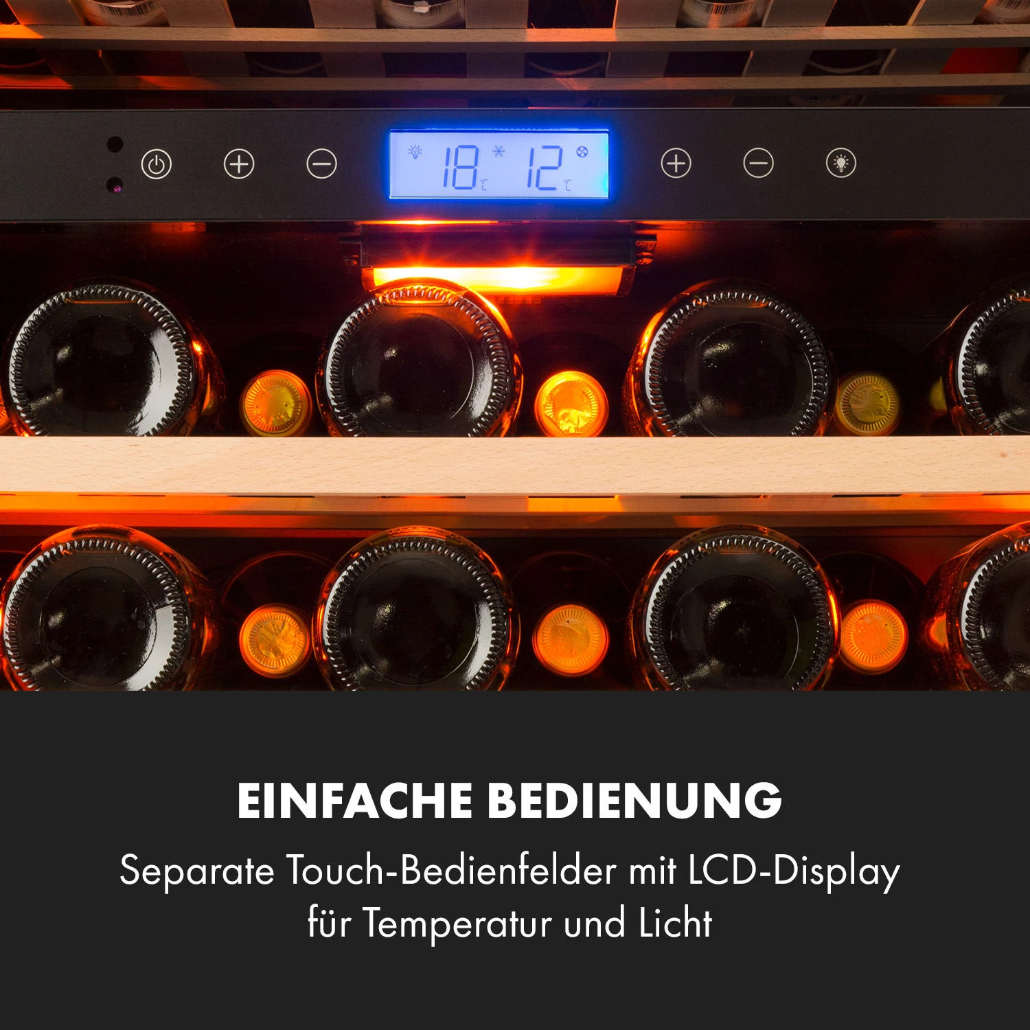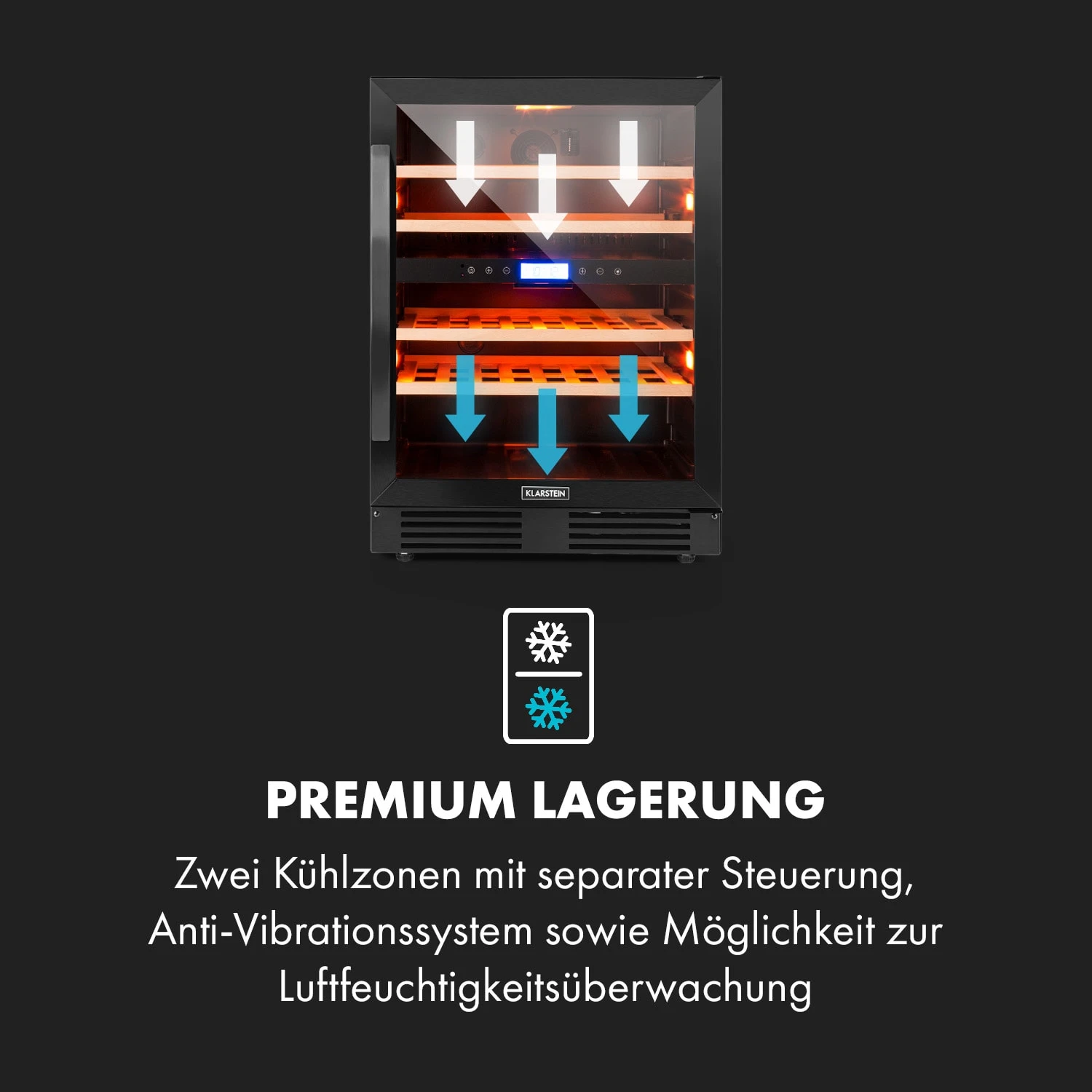 Edles Design und farbige Präsentation: Der Klarstein Vinovilla 43 Built-In Duo Onyx Edition Doppelzonen-Weinkühlschrank schenkt deinen Weinen die perfekte Trinktemperatur und setzt sie gekonnt in ein schönes Licht. Neben der modernen gerahmten Glastür trumpft der Vinovilla 43 Built-In Duo Onyx Edition vor allem durch seine zwei Kühlzonen mit unterschiedlichen Lagertemperaturen auf. Dank diesen kannst du weiße und rote Weine gleichzeitig kühlen und optimal lagern. Ein großes Highlight ist dabei die dreifarbige Beleuchtung, welche die Flaschen raffiniert in Szene setzt. Der Weinkühlschrank 2 Zonen bietet somit eine flexible Lösung für Weinliebhaber.