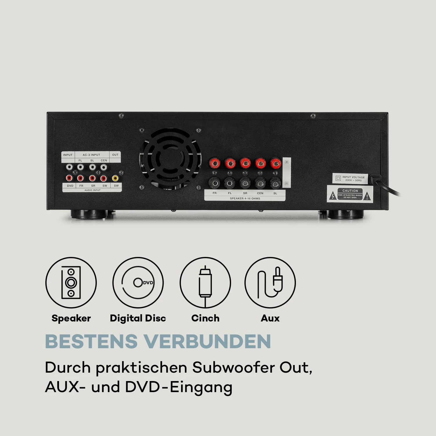 - Anschlüsse: 3 x Stereo-Cinch-Audio-Eingang, 1 x Stereo-Cinch-DVD-Eingang, 1 x Cinch-Subwoofer-Ausgang, 5 x Satz Schraubklemmen zum Anschluss der Lautsprecher, 1 x Antennen-Eingang, 2 x 6,3mm-Klinke-Mikrofon-Eingang (frontseitig), 1 x 3,5mm-Klinke-AUX-Eingang (frontseitig), 1 x USB-Port (frontseitig), 1 x SD-Slot (frontseitig)