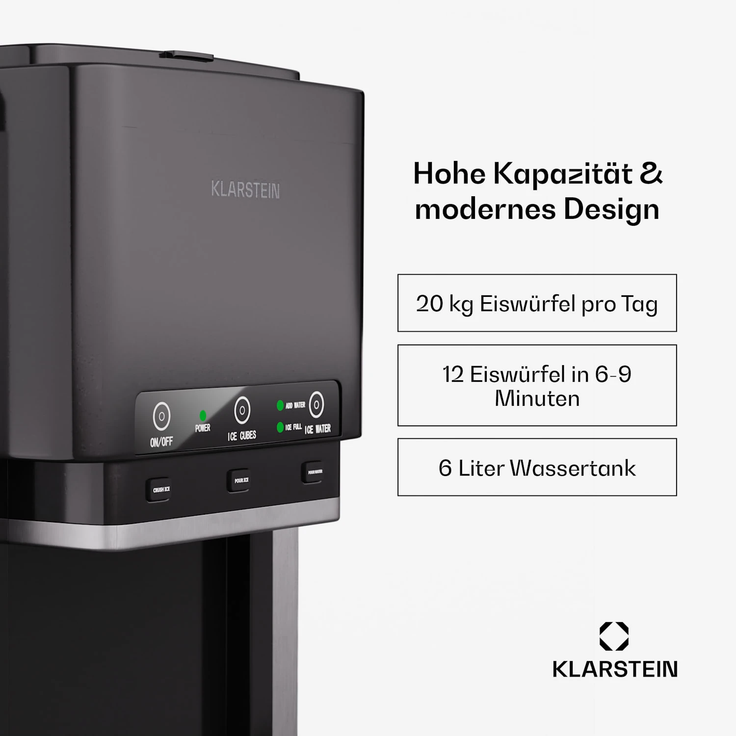 Hohe Kapazität: Der 6-Liter-Wassertank und die Fähigkeit, bis zu 20 kg Eis pro Tag zu produzieren, machen ihn ideal für den Einsatz bei größeren Anlässen