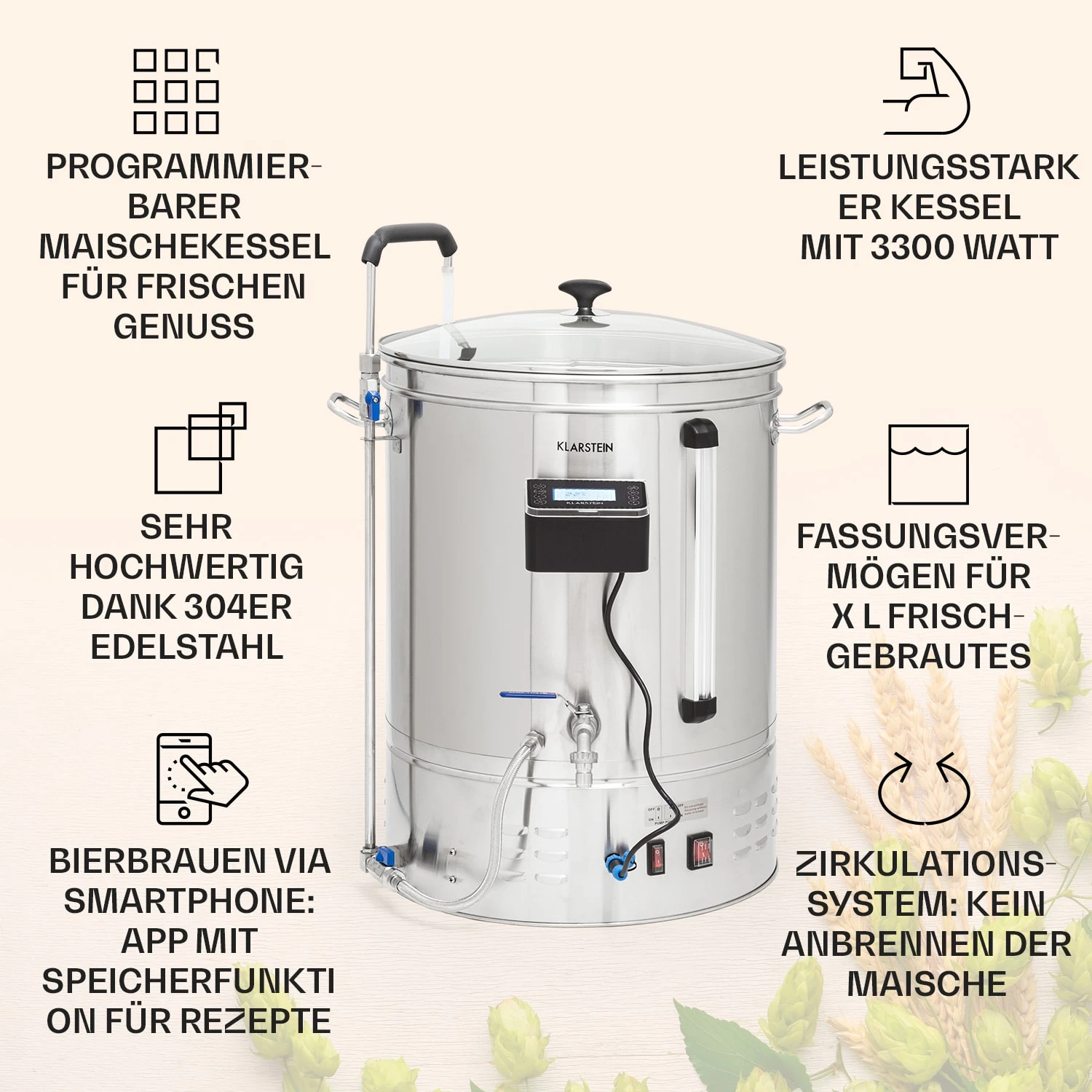 - SmartHome: komplette Steuerung des Maischens per Klarstein-App vom Smartphone, iPhone oder Tablett