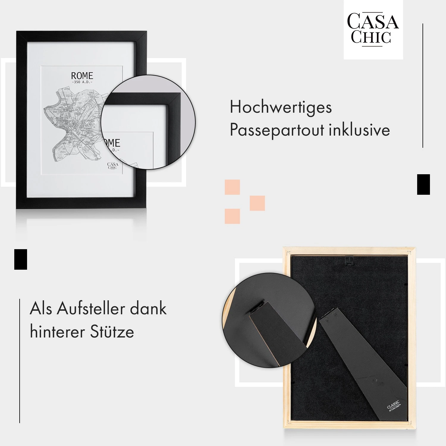 - Aufsteller und Aufhängung bereits am Rahmen montiert