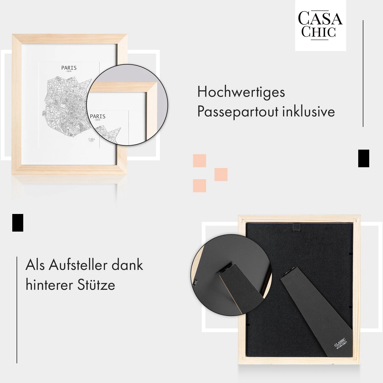 - Aufsteller und Aufhängung bereits am Rahmen montiert