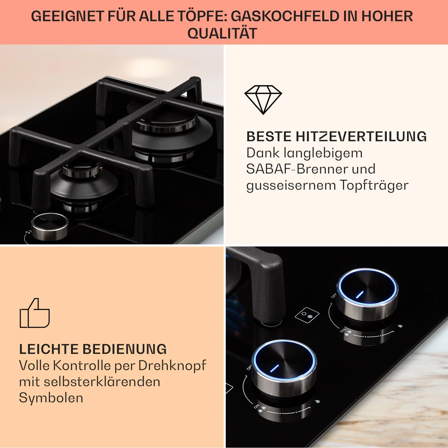 - Durchmesser Kochgeschirr Hilfsbrenner: ca. 10 – 15 cm (Ø)