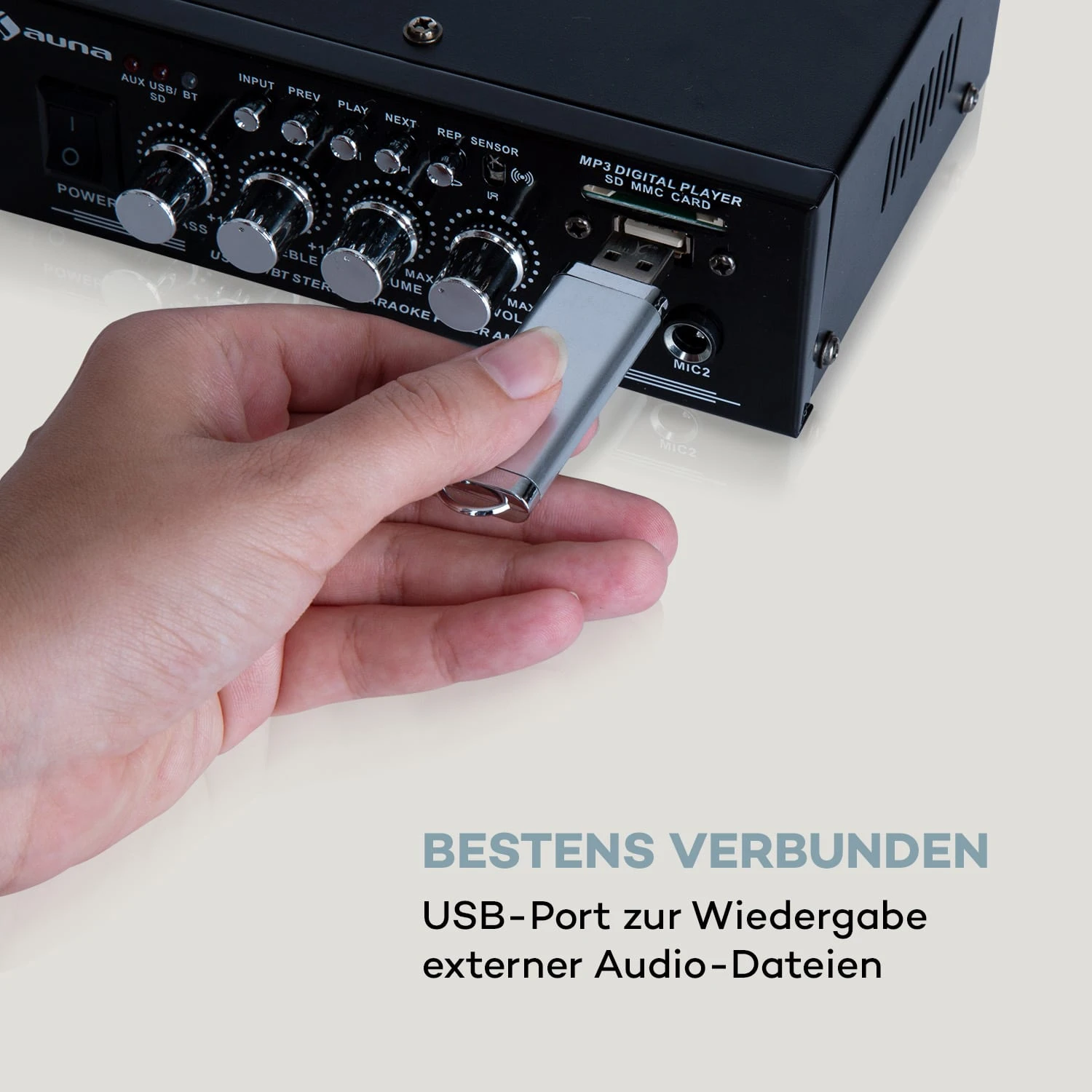 - Anschlüsse: 1 x USB-Port, 1 x SD-Port, 2 x 3,5 mmm Mikrofon-Klinken-Eingang, 1 x RCA-Line-Eingang, 2 x Lautsprecherklemme-Eingang, 1 x DC 12V/5A-Eingang