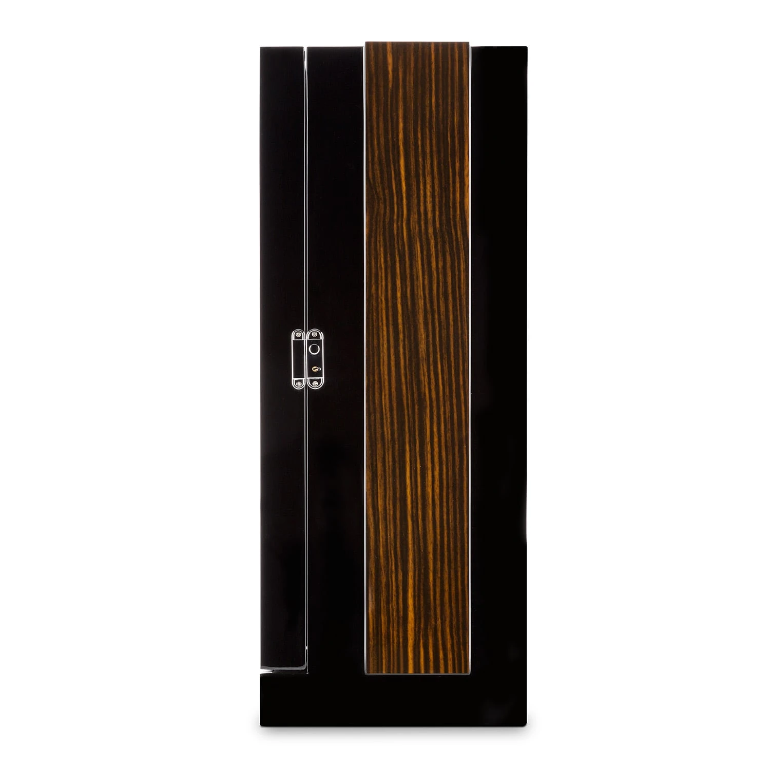 eleganter Präsentations-Schaukasten aus Holz in schwarzer Lack-Optik mit schwarzer Samt-Innenbespannung und schwarzen Schaumkissen
