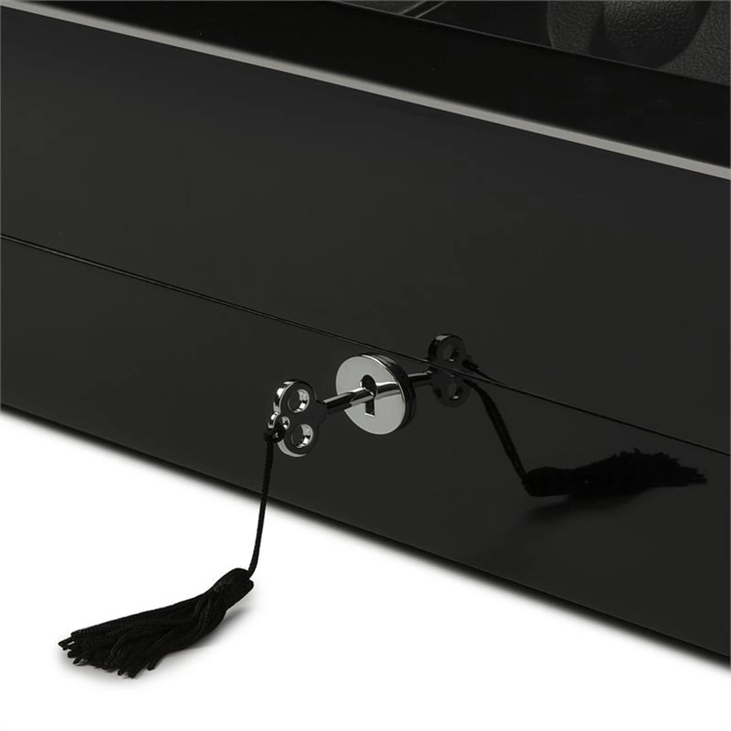 dekoratives Design mit flächig aufgetragenem, auf Hochglanz polierten schwarzen Pianolack-Überzug und großen Sichtfenster