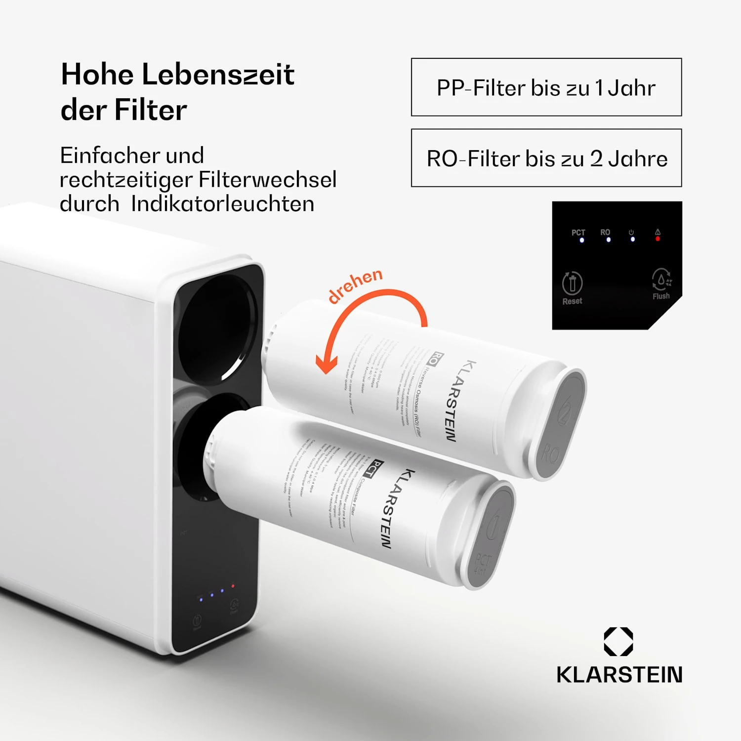 - 5 Filterstufen: 1. PP filter (Schwebteilchenfilter), 2. Aktivkohlefilter (Geruchs- & Geschmacksstoffe), 3. Hochpräzisions-PP-Filter (Feinstschwebteilchenfilter), 4. RO-Filter (Filter für gelöste Teilchen), 5. Kohlenstoff-Filter (Mikroben)