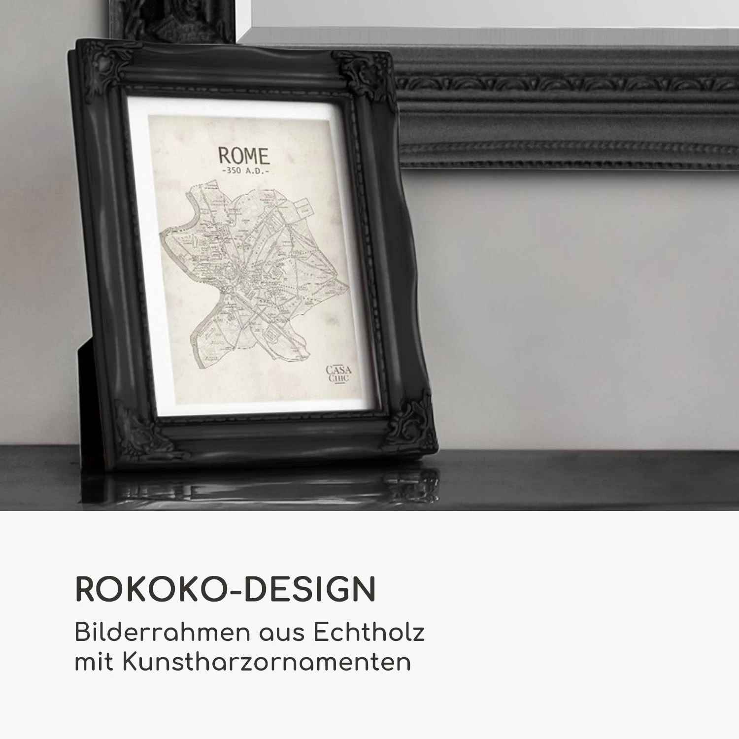 Rokoko-Design: Bilderrahmen aus Echtholz mit Kunstharzornamenten