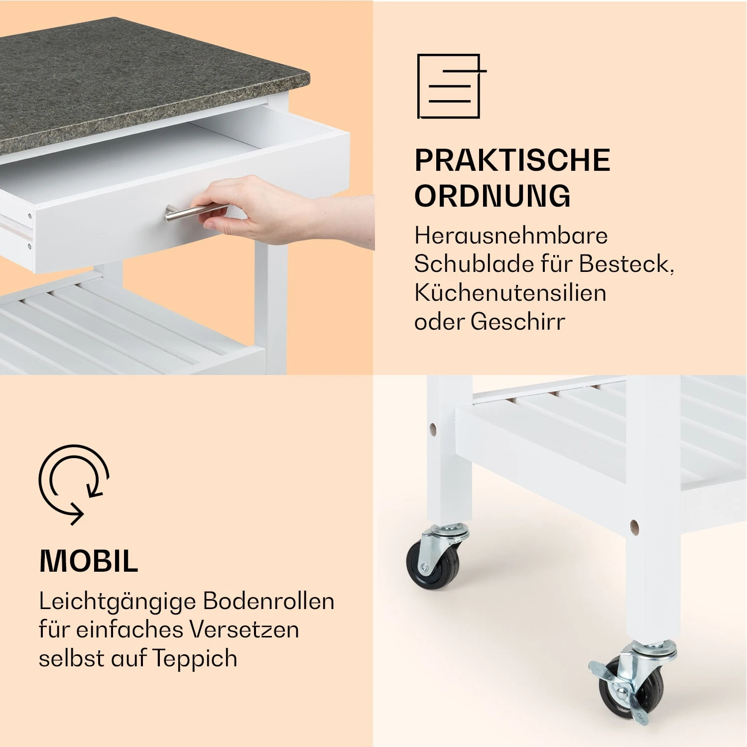 Mehr Platz: luxuriöser Küchenwagen für zusätzliche Arbeitsfläche mit zahlreichen Staumöglichkeiten